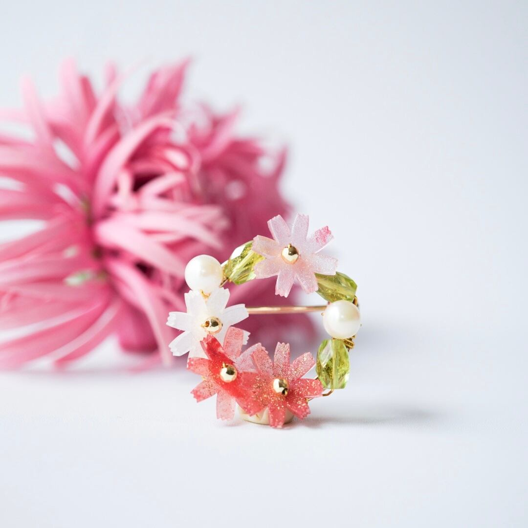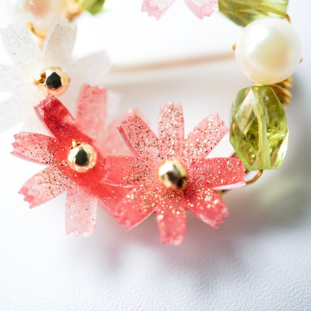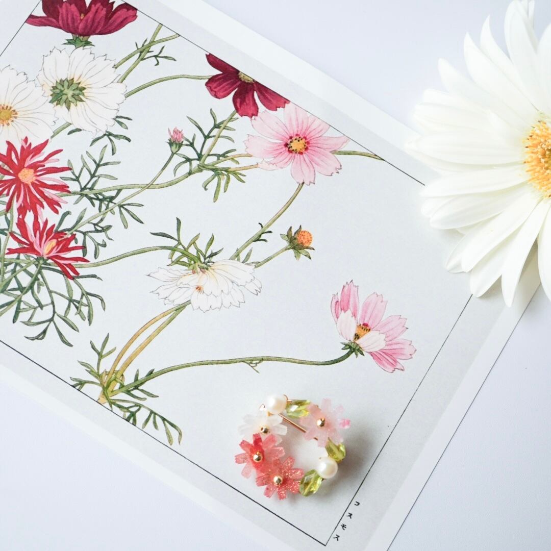 プラ板に彩色を施したコスモスのお花をメインに、瑞々しい葉をペリドットで、愛らしさをプラスする花芯にヘマタイト、そして可憐なあこや真珠を添えています。