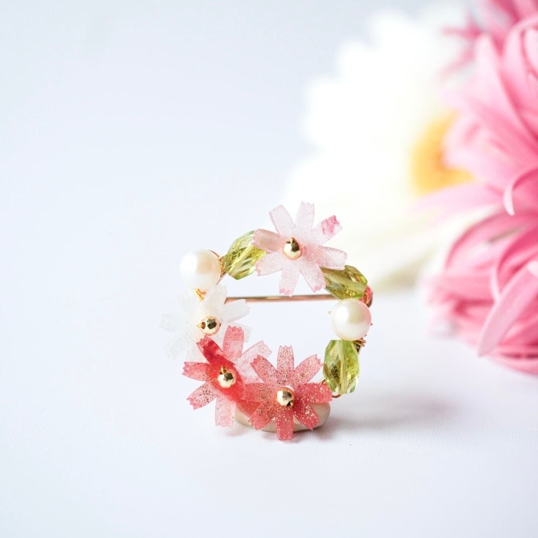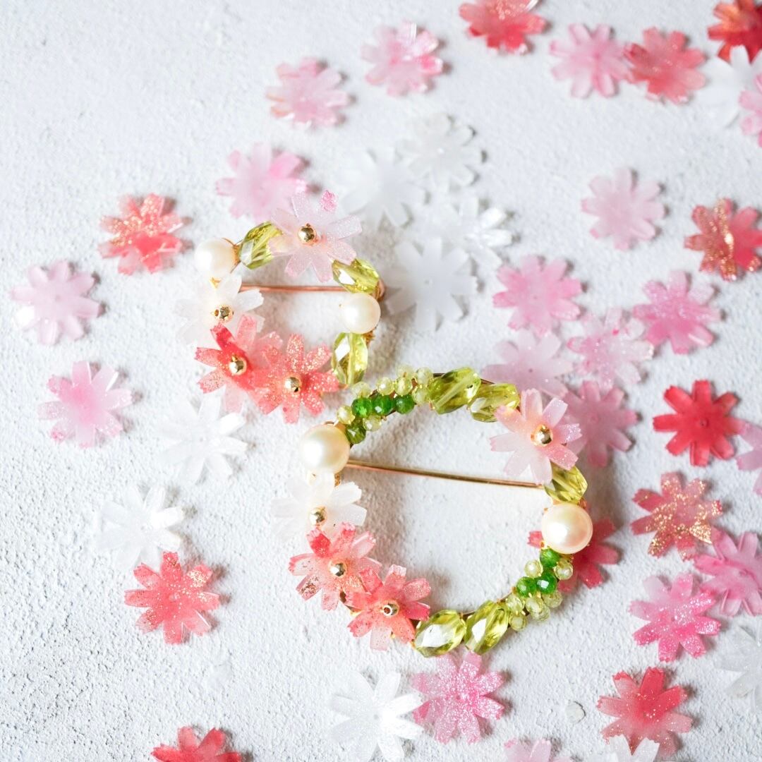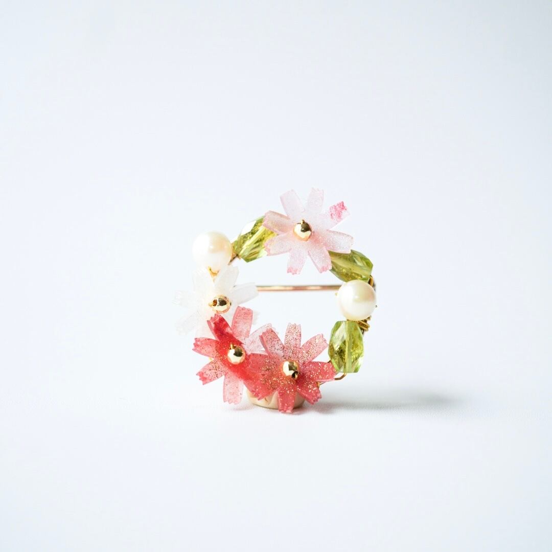 プラ板に彩色を施したコスモスのお花をメインに、瑞々しい葉をペリドットで、愛らしさをプラスする花芯にヘマタイト、そして可憐なあこや真珠を添えています。