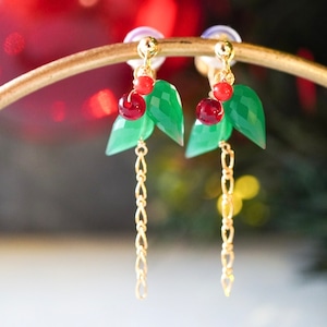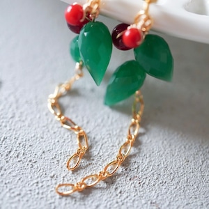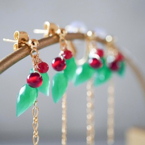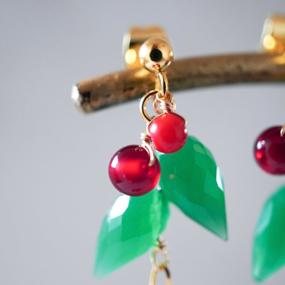 イヤーアクセサリーは、グリーンアベンチュリンで柊の葉を、実は赤さんごとチェリーカラーカルセドニーで実を表現しました。