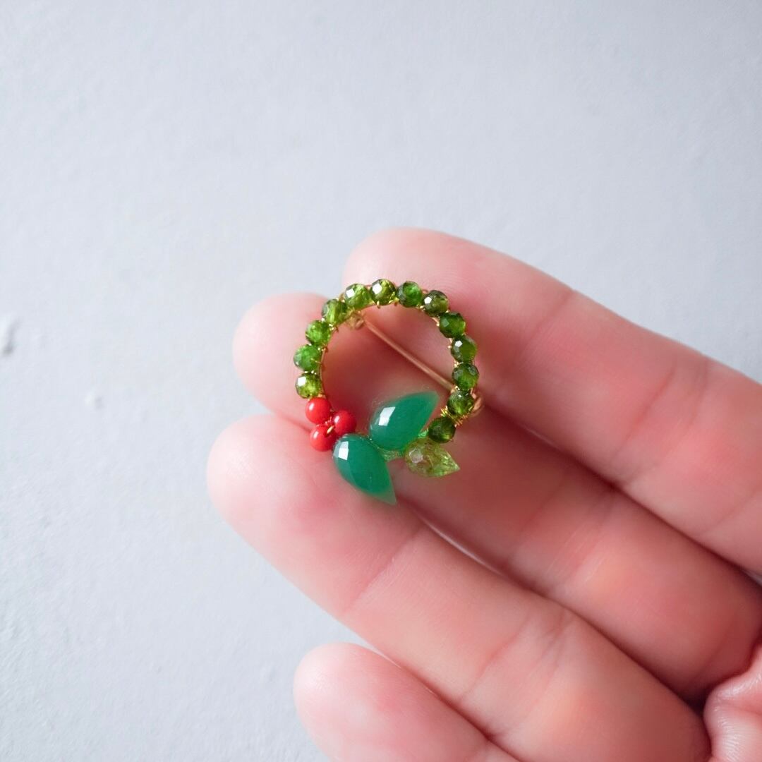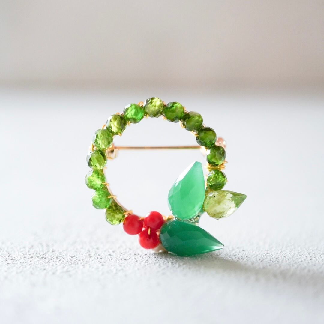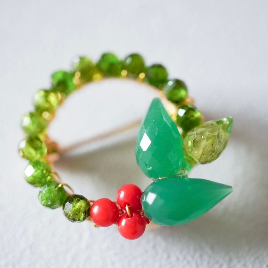 ブローチはグリーンアベンチュリンとペリドットで柊の葉を、実は赤さんごで表現。