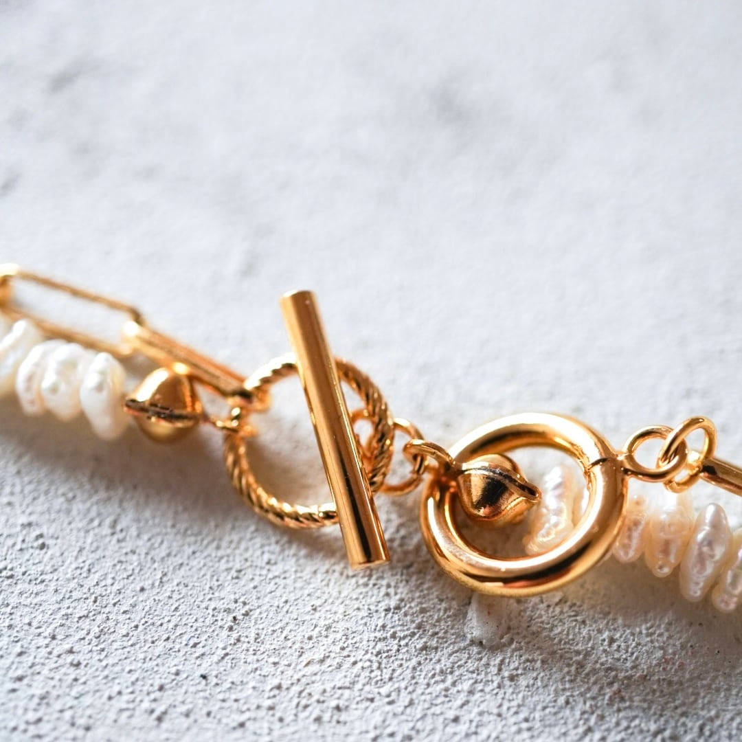 淡水パールの柔らかな輝きと、スタイリッシュなK16GPチェーンを組み合わせたネックレス