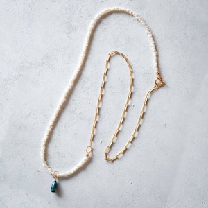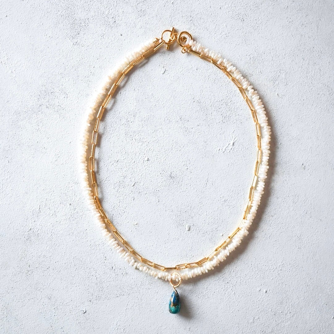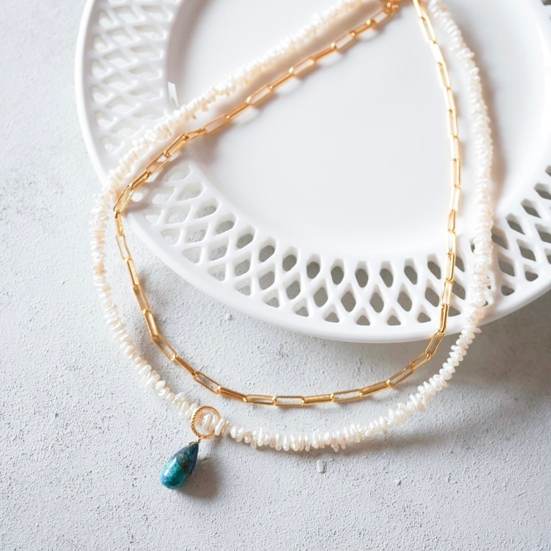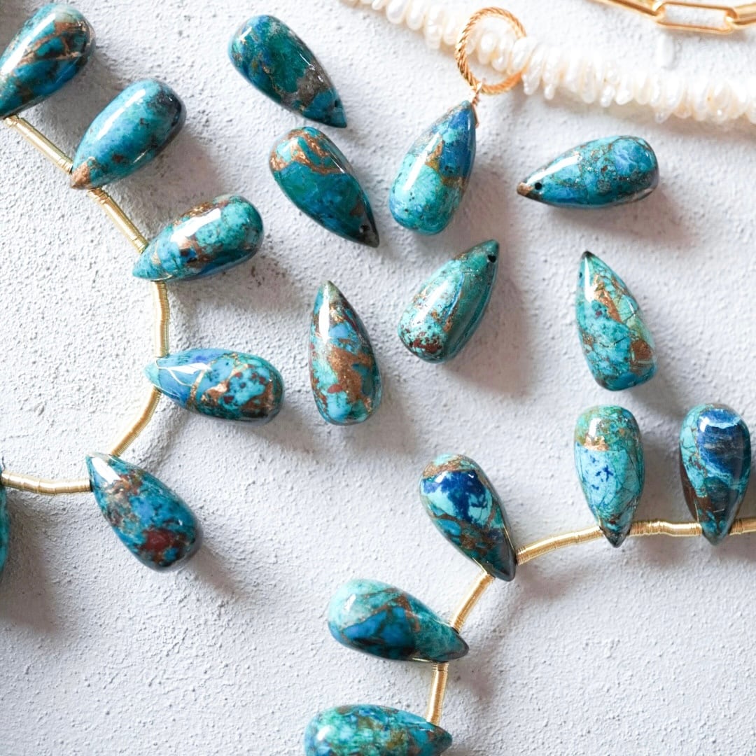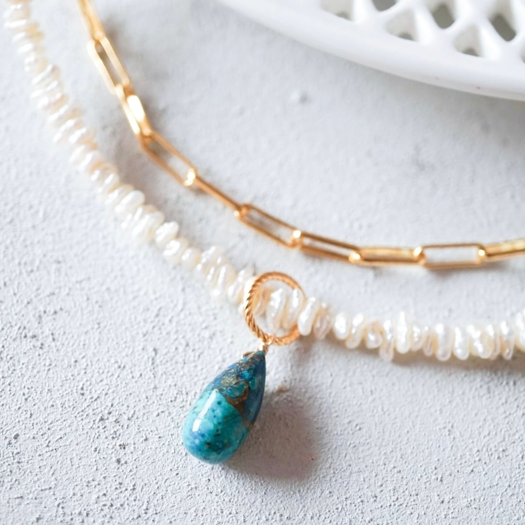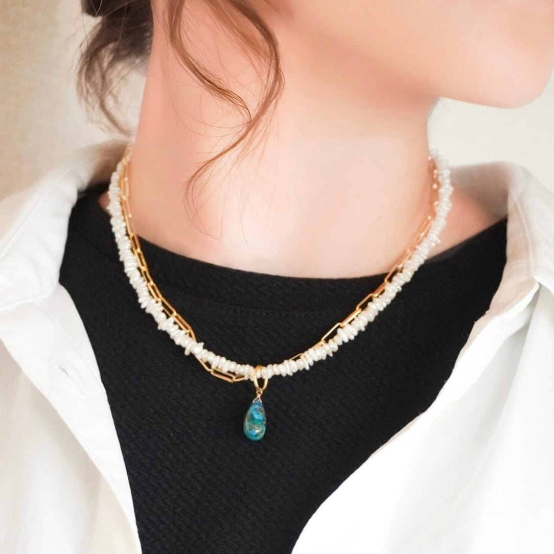 トップにあしらった雫型のクリソコラコッパーは、ターコイズのような青いお石にコッパー(銅)が入ることによって高級感のある高見えするデザインとなっています