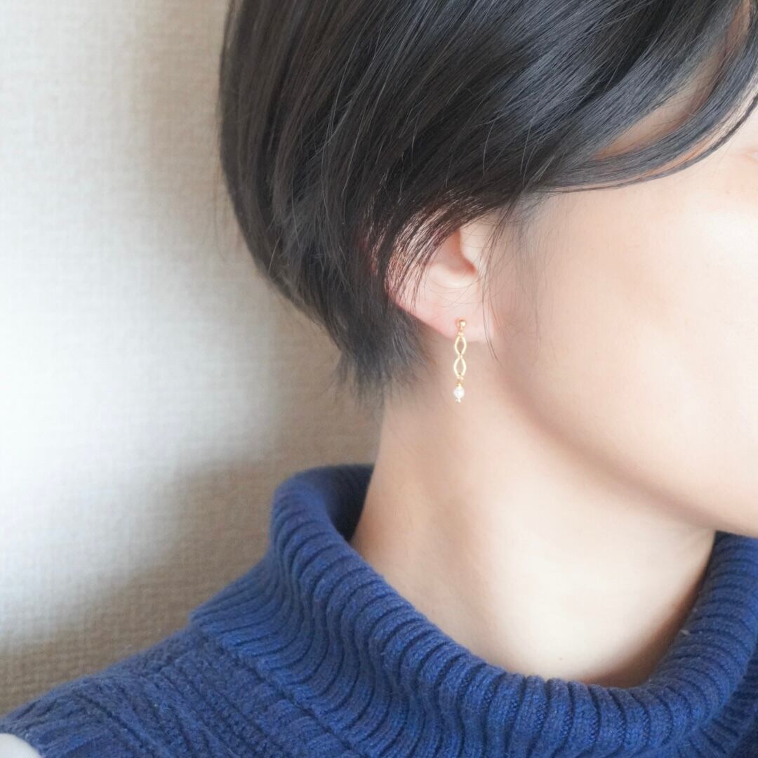 ひし形の連なりが光を受けて繊細にきらめき、その下で揺れるあこや真珠が、耳元にそっと上品さを添えてくれる、華奢で軽やかなラインに仕立てました。