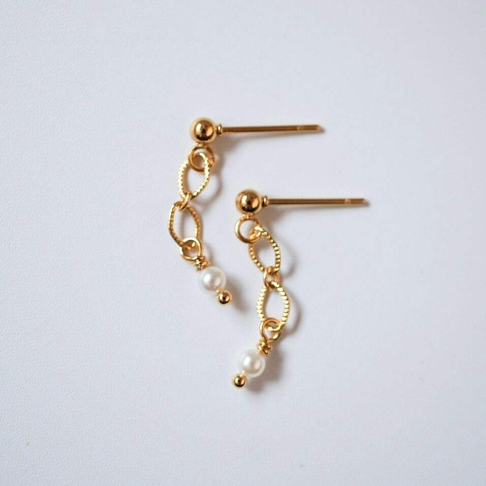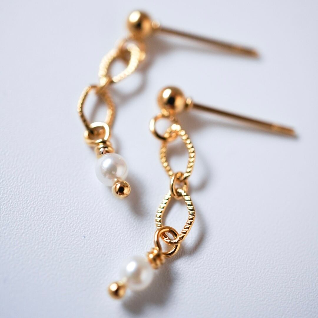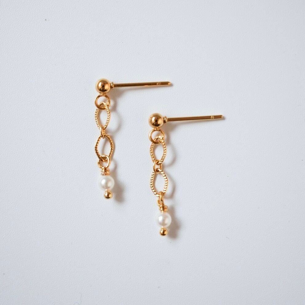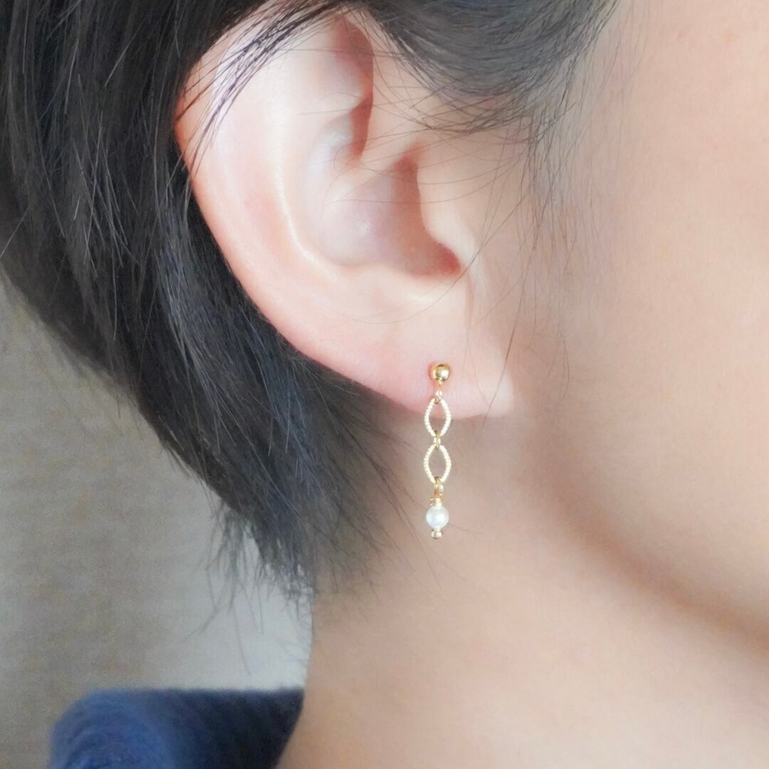 三重県から取り寄せた上質なあこや真珠に、小さなひし形が2つ連なる繊細チェーンを合わせた、シンプルながらも凛としたエレガントさをまとったイヤリング/ピアスです。