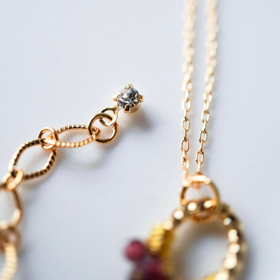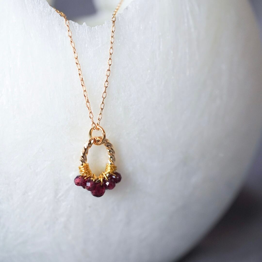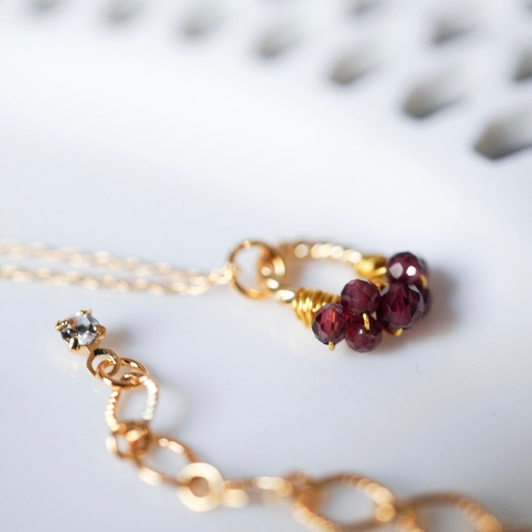 ツイストのかかった楕円形カンに、大小大きさの違うガーネットをあしらい、光を含んだときの陰影が美しく際立つネックレスです。