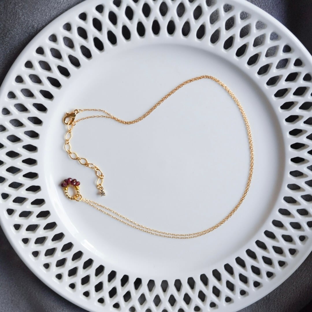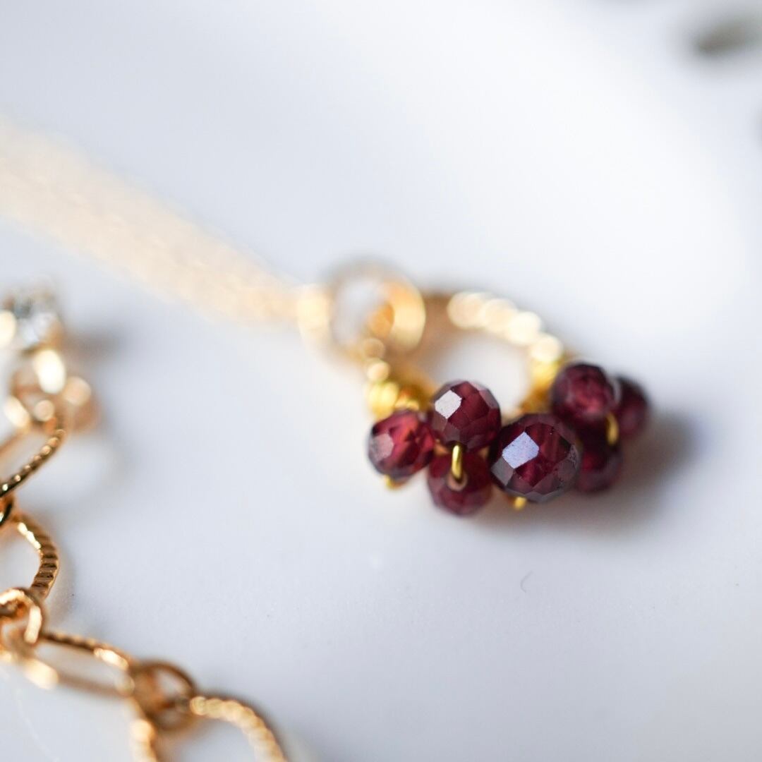 ・深紅のガーネットが鎖骨ラインを明るく見せ、シンプルなニットやシャツを上品に格上げ。