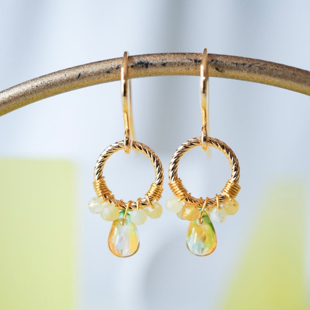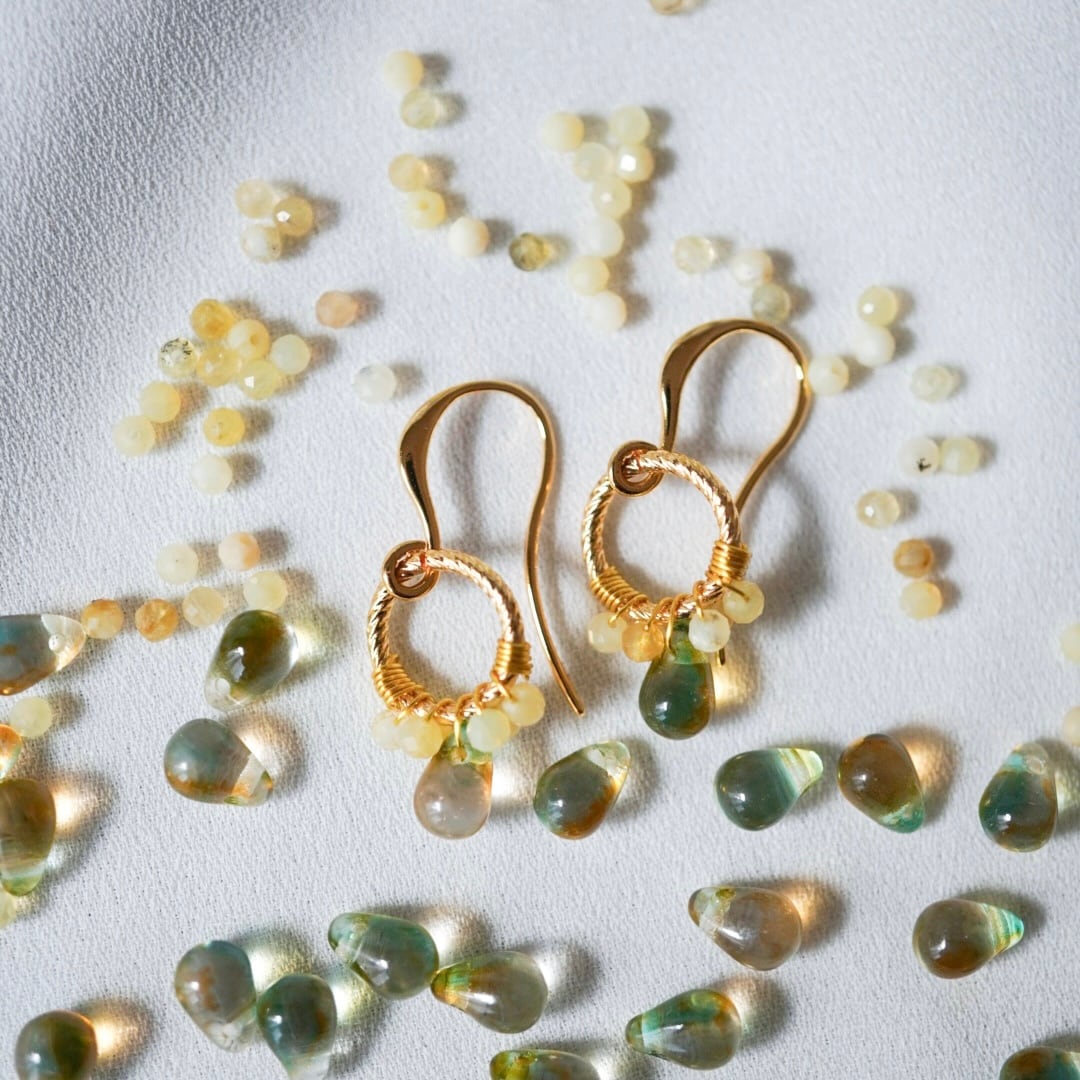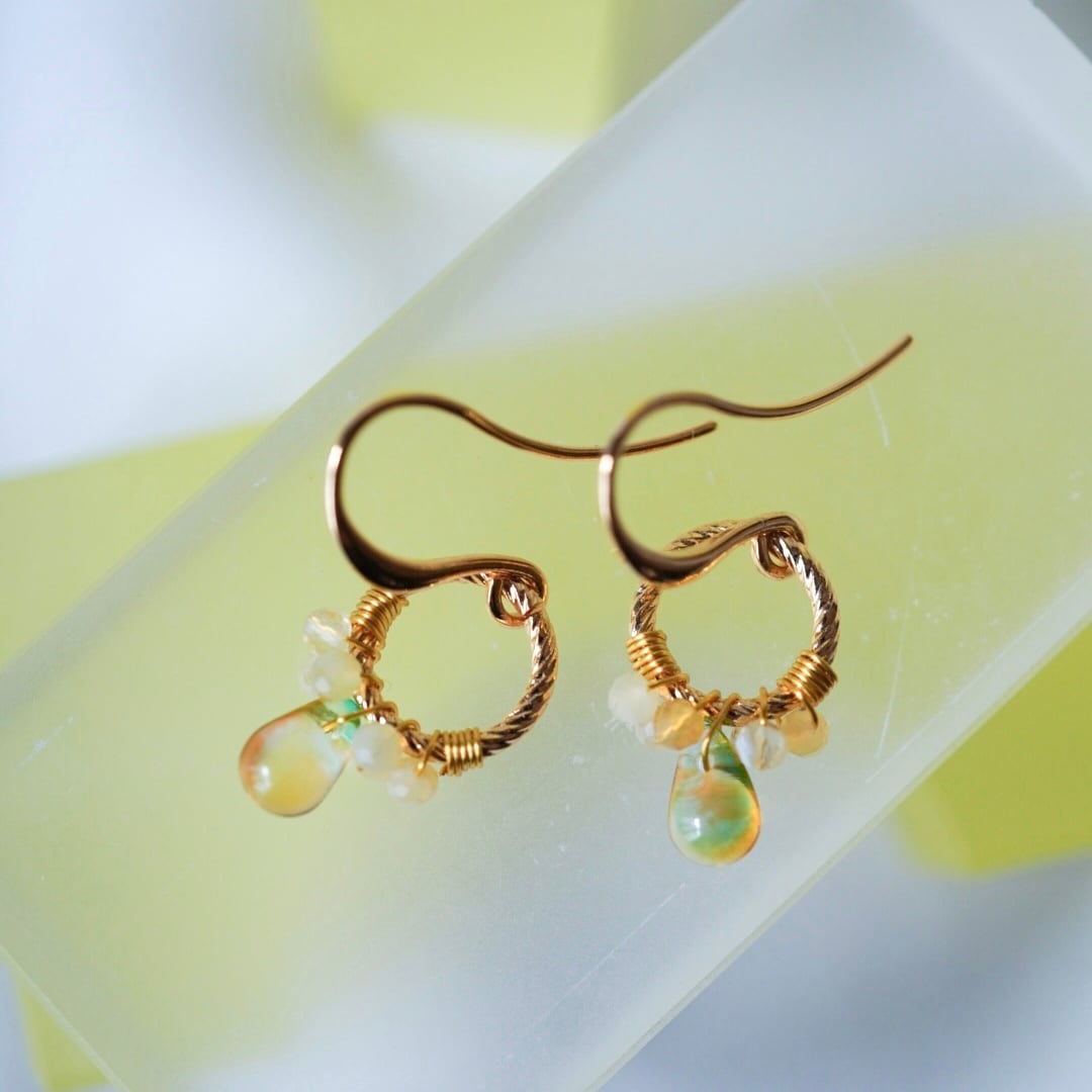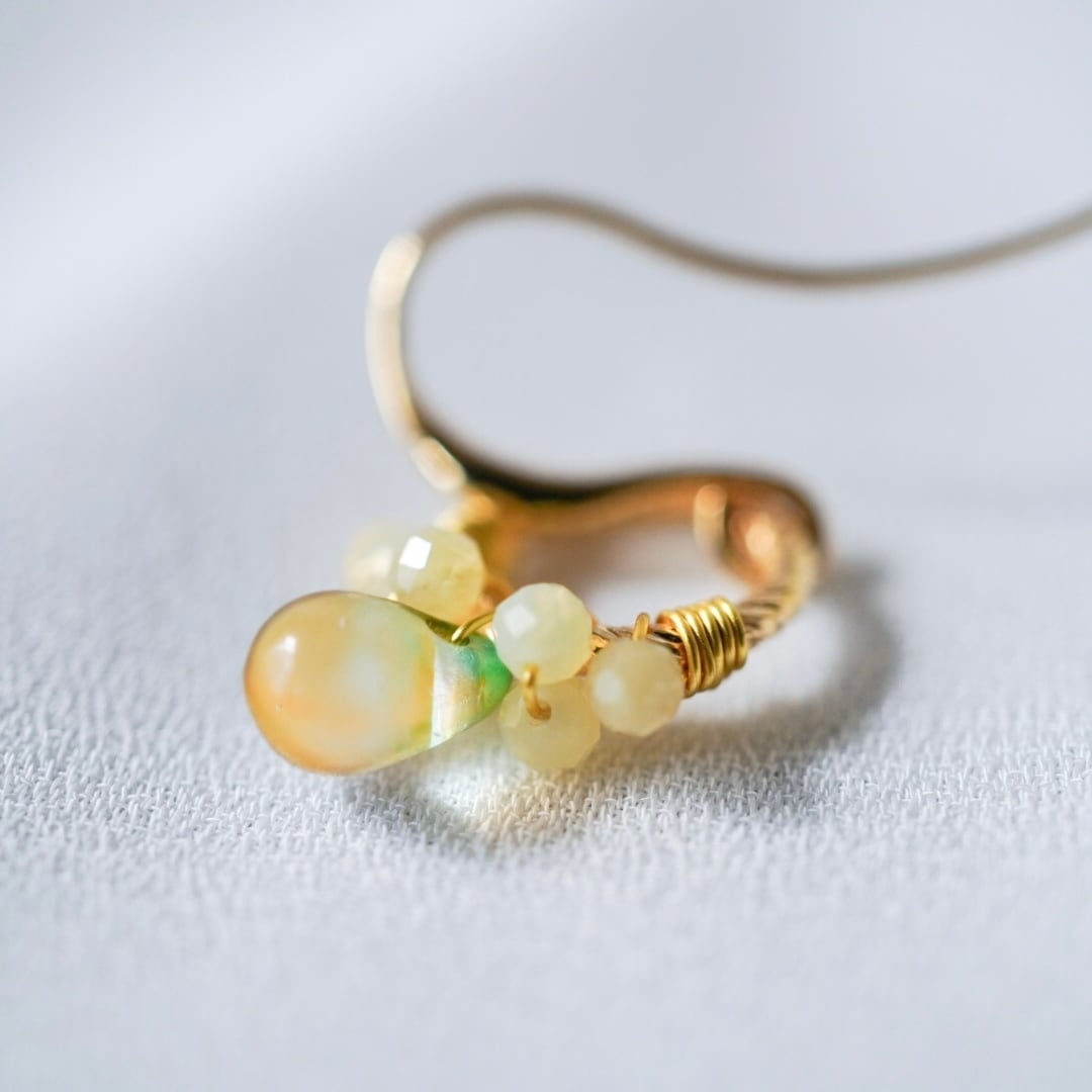 やわらかな黄色のイエローオパールと、ほのかにグリーンを含んだチェコビーズをひとつひとつ丁寧にワイヤーで留め、メインには透明感のある雫型のチェコガラスを添えました。