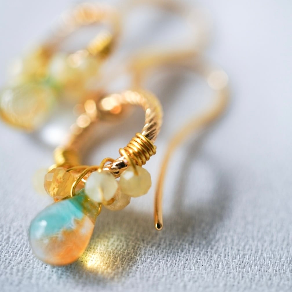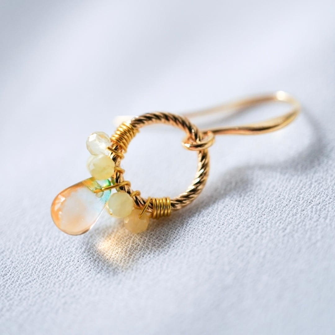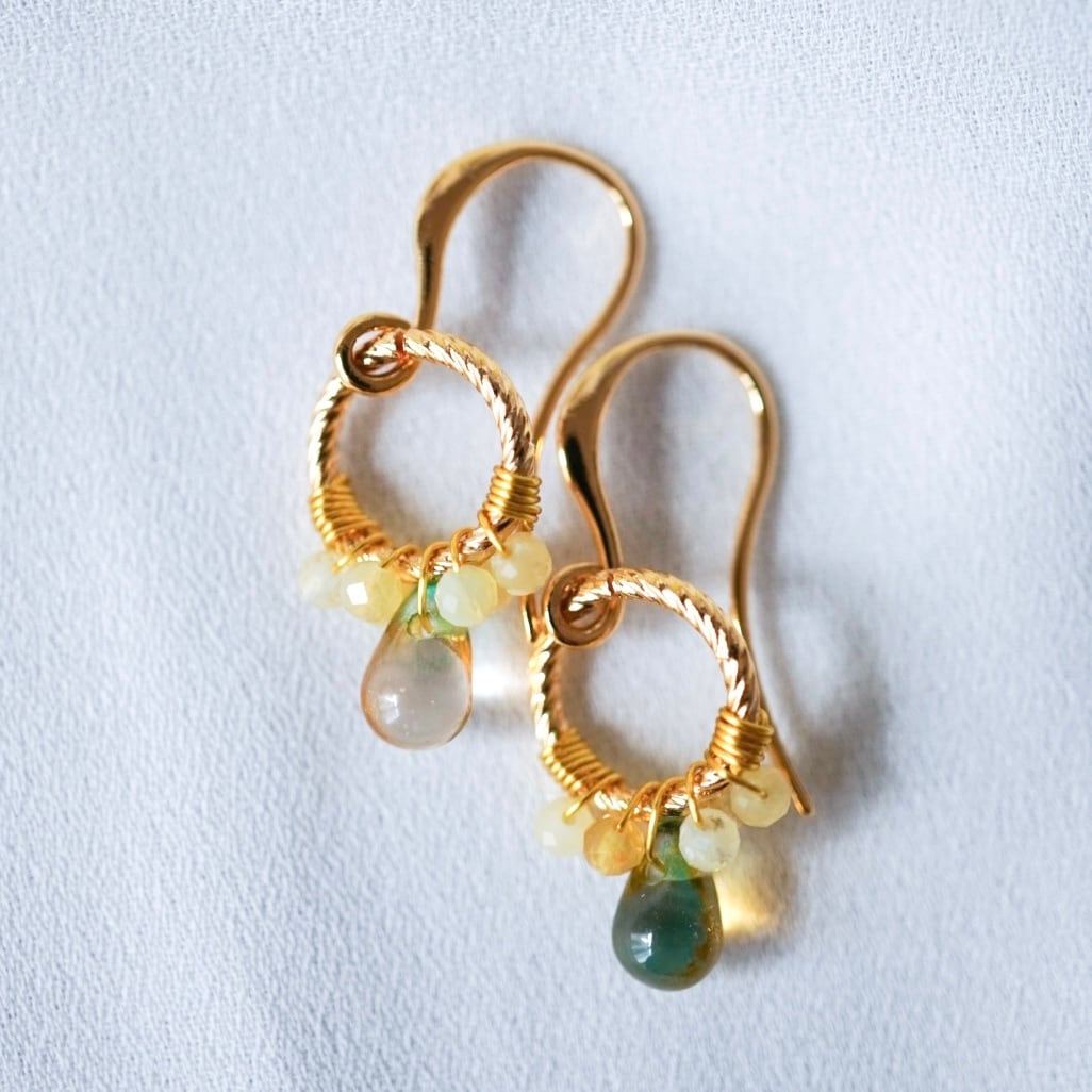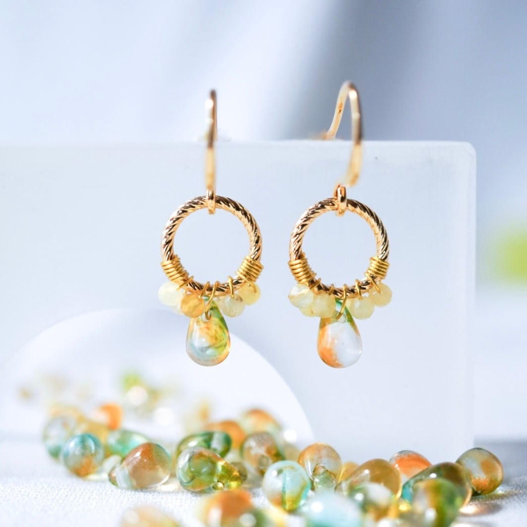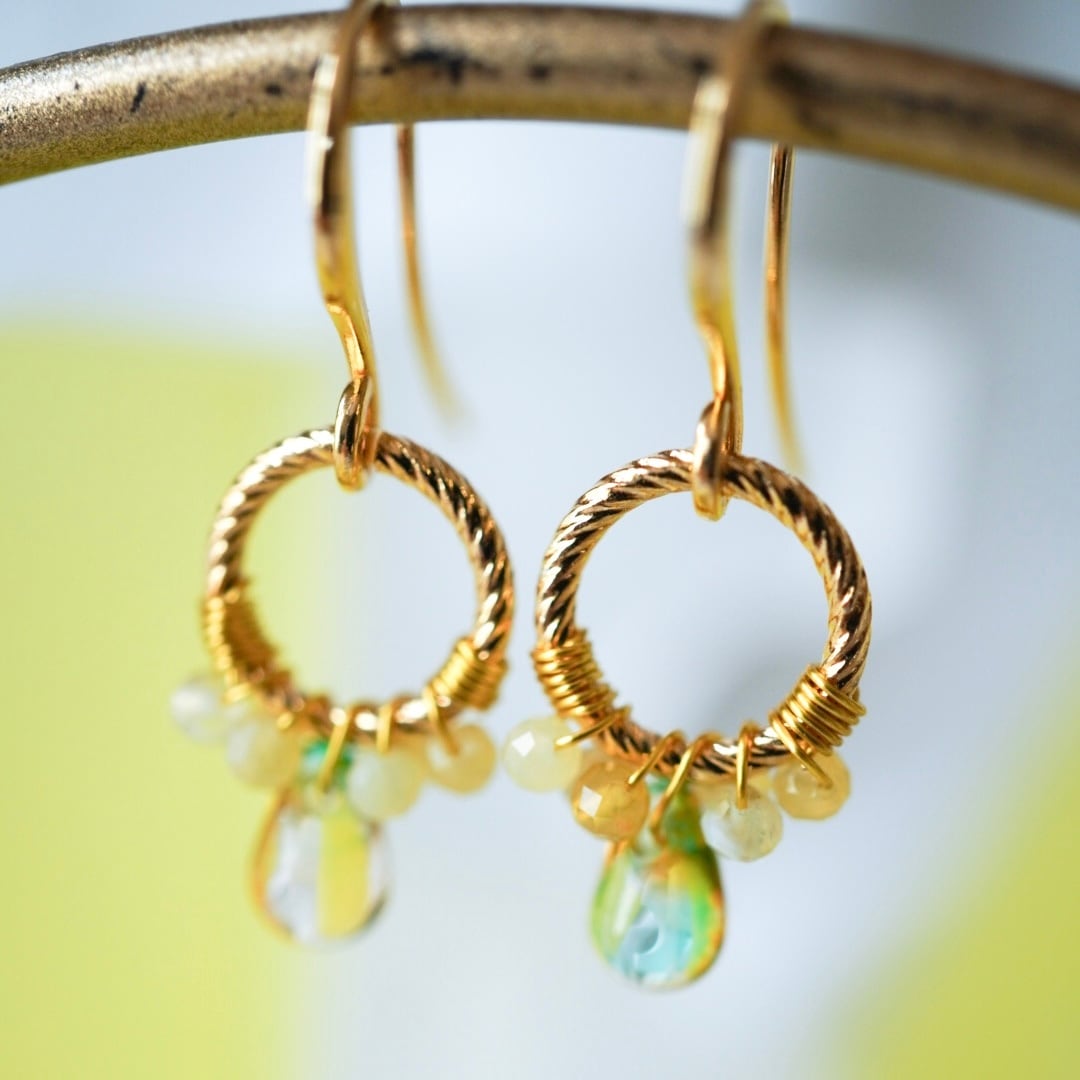 やわらかな黄色のイエローオパールと、ほのかにグリーンを含んだチェコビーズをひとつひとつ丁寧にワイヤーで留め、メインには透明感のある雫型のチェコガラスを添えました。