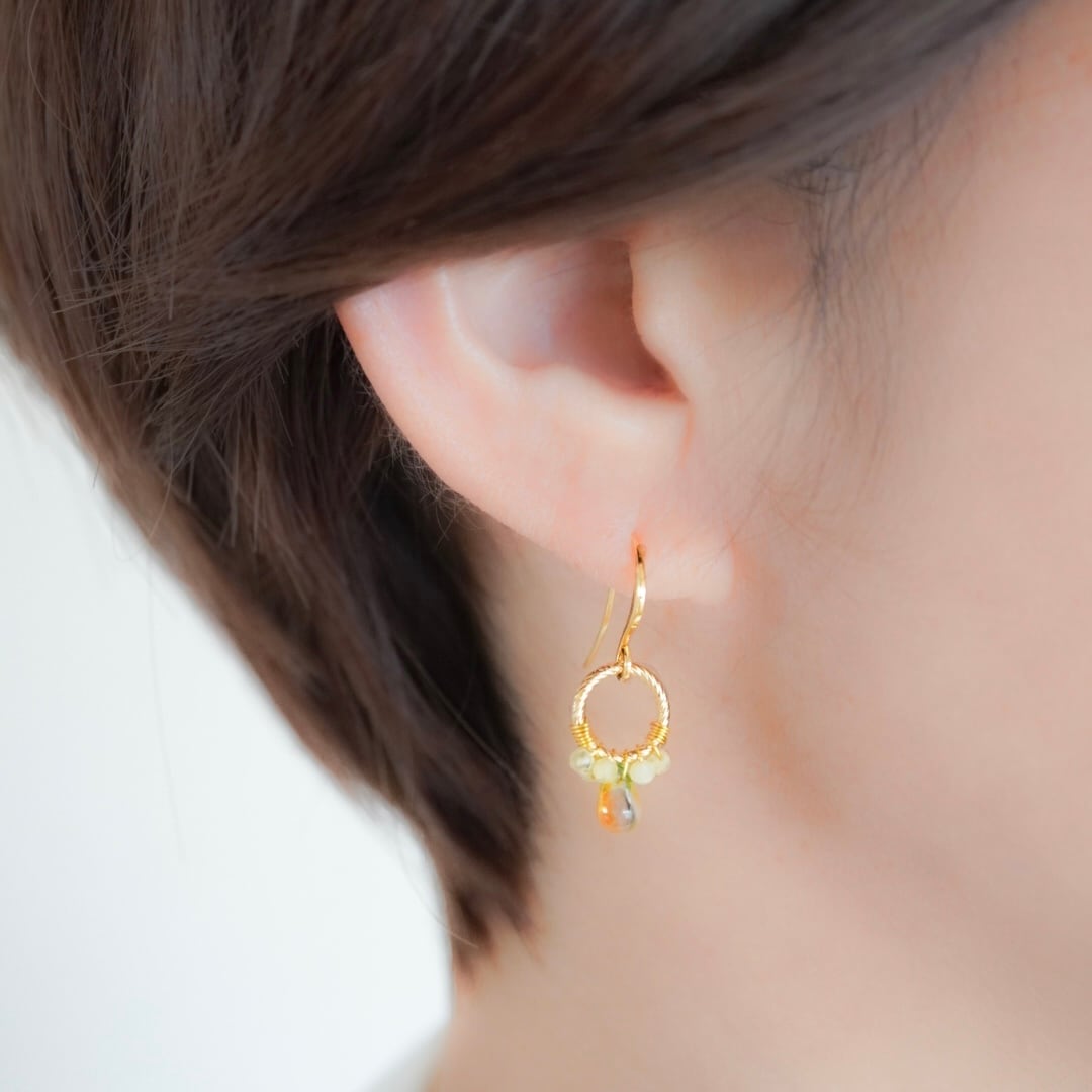 光を受けるたびにリズムよく揺れ、ミモザの花の下で揺れる光や、春の風の気配を感じるようなやわらかな表情のイヤーアクセサリーに仕立てています。