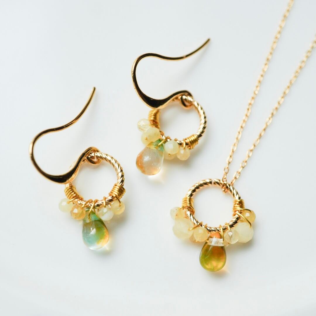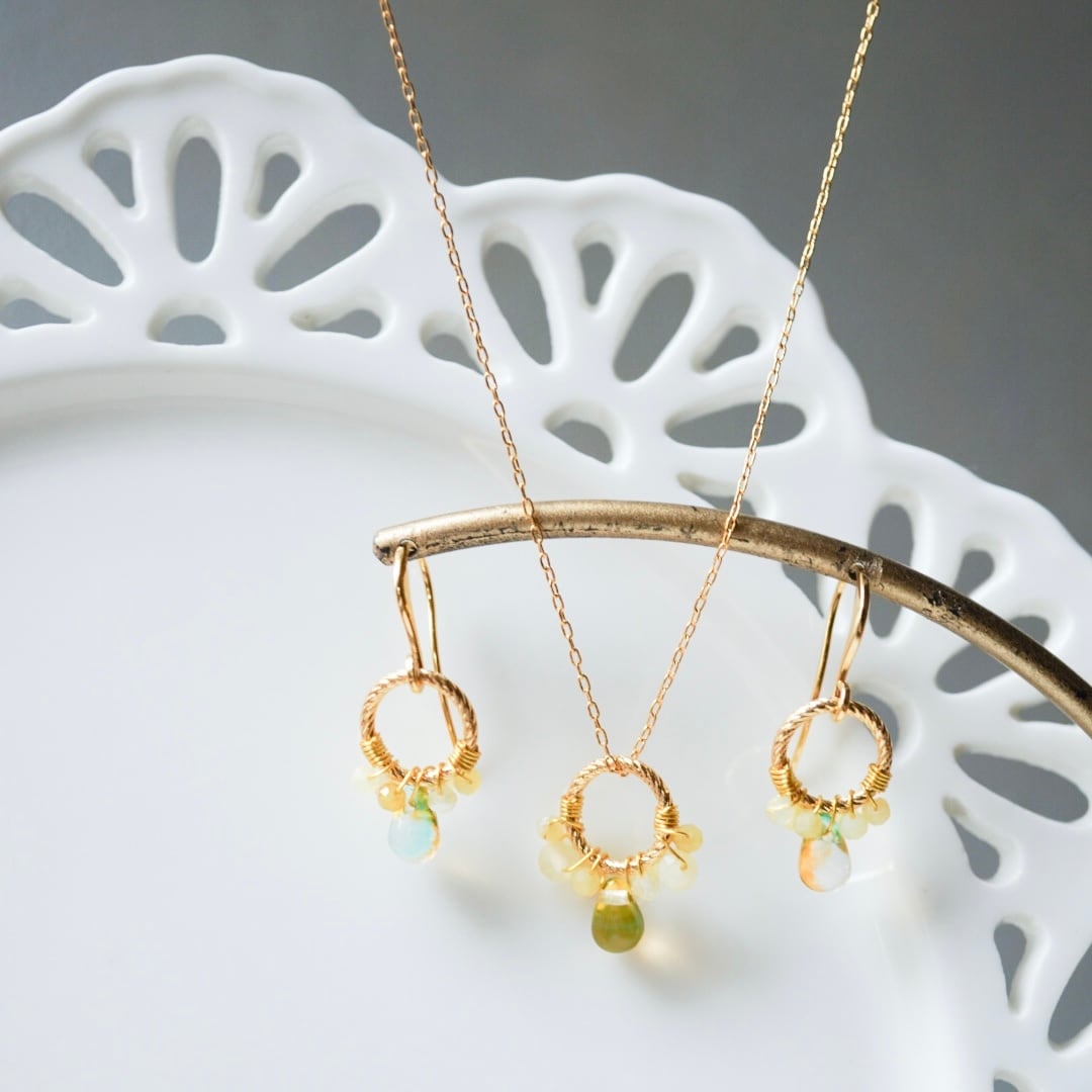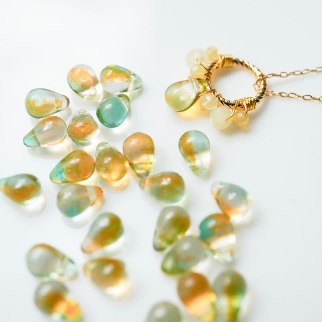 やわらかな黄色のイエローオパールをひとつひとつ丁寧にワイヤーで留め、メインにはほのかにグリーンを含んだ透明感のある雫型のチェコガラスを添えました。