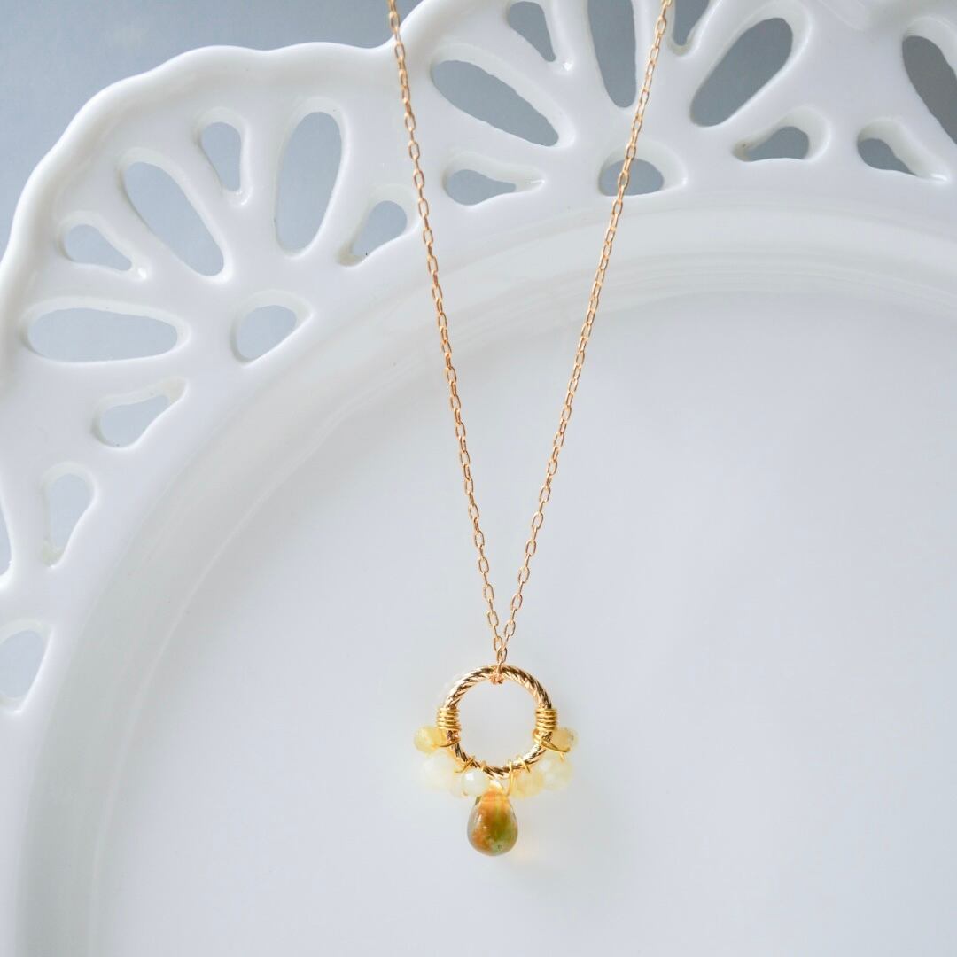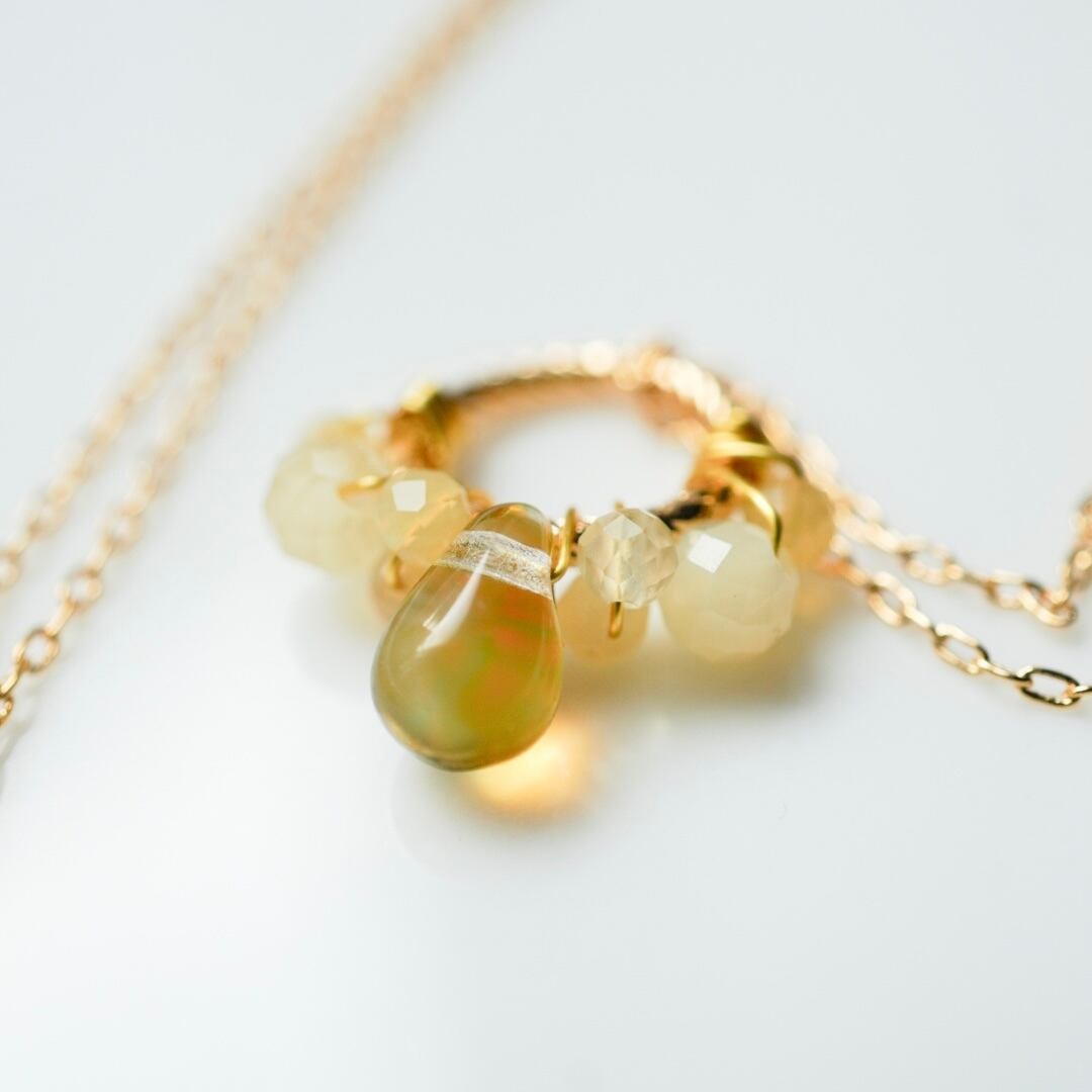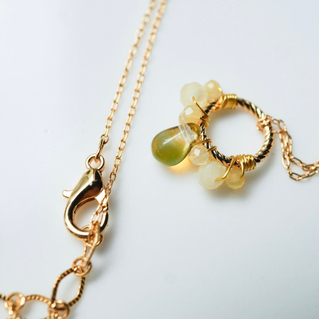 やわらかな黄色のイエローオパールをひとつひとつ丁寧にワイヤーで留め、メインにはほのかにグリーンを含んだ透明感のある雫型のチェコガラスを添えました。