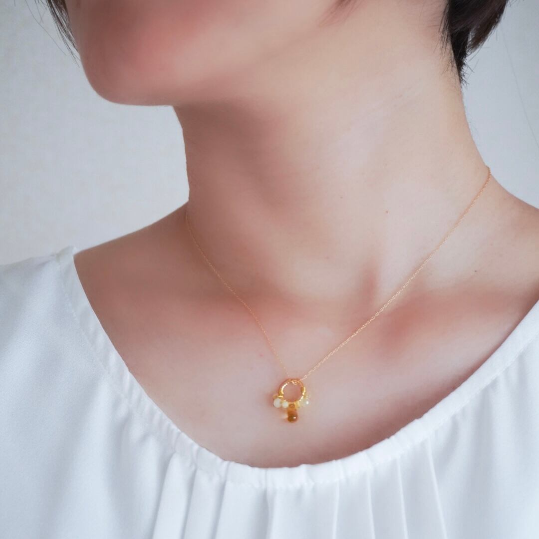 光を受けるたびにリズムよく揺れ、まるでミモザの花の下で揺れる光や春の風の気配を感じるような、やさしく軽やかな表情のネックレスです。