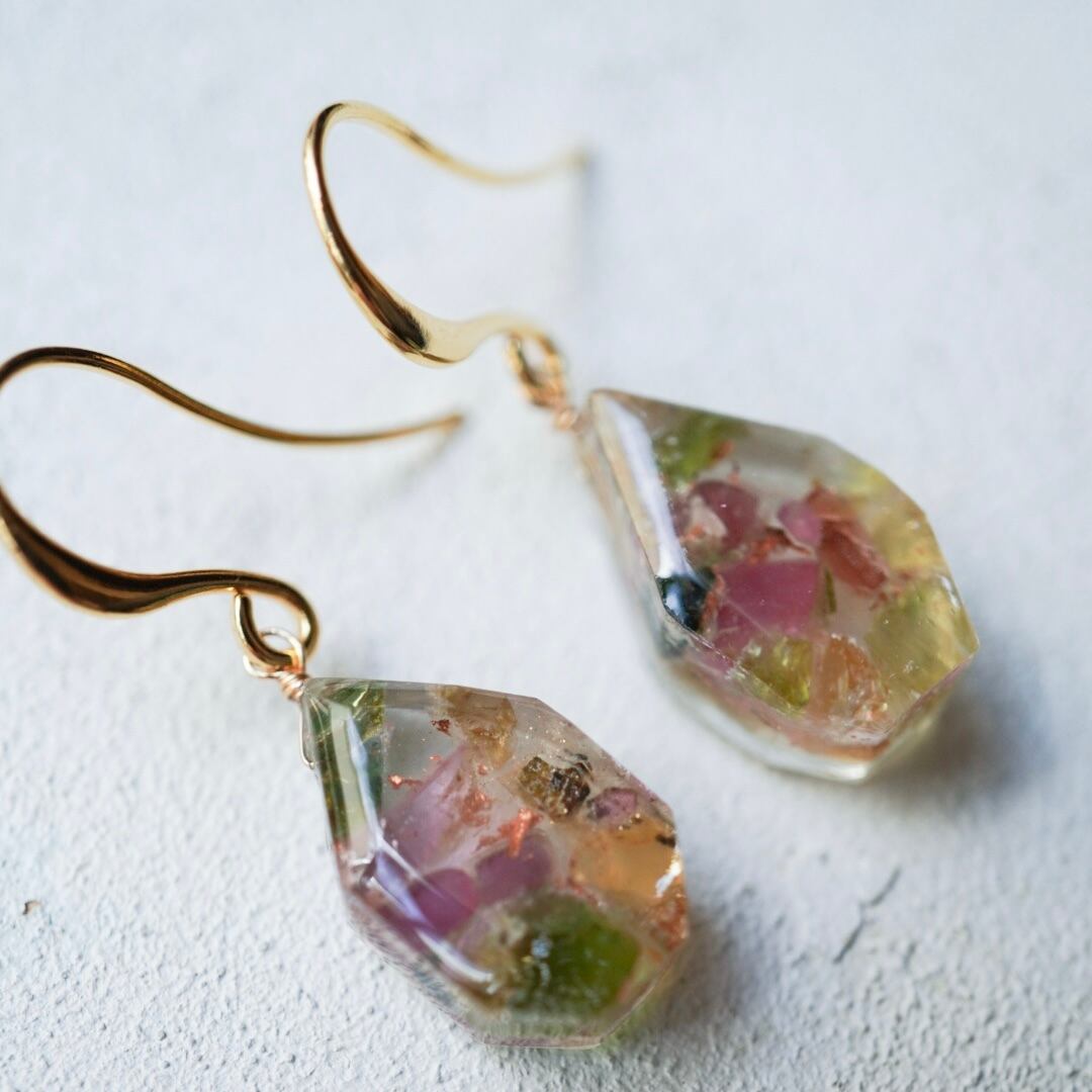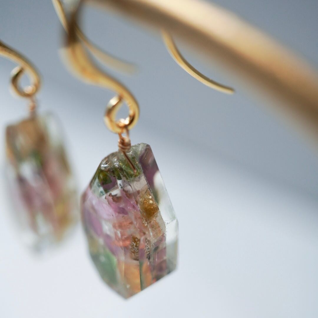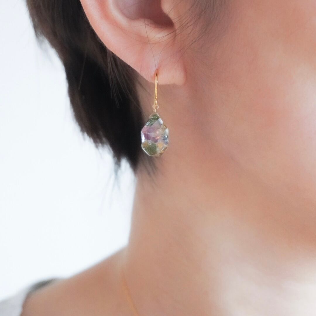 透明感のある水晶で、砕いたトルマリンを挟み込んだ合成石を使用したフックピアスです。