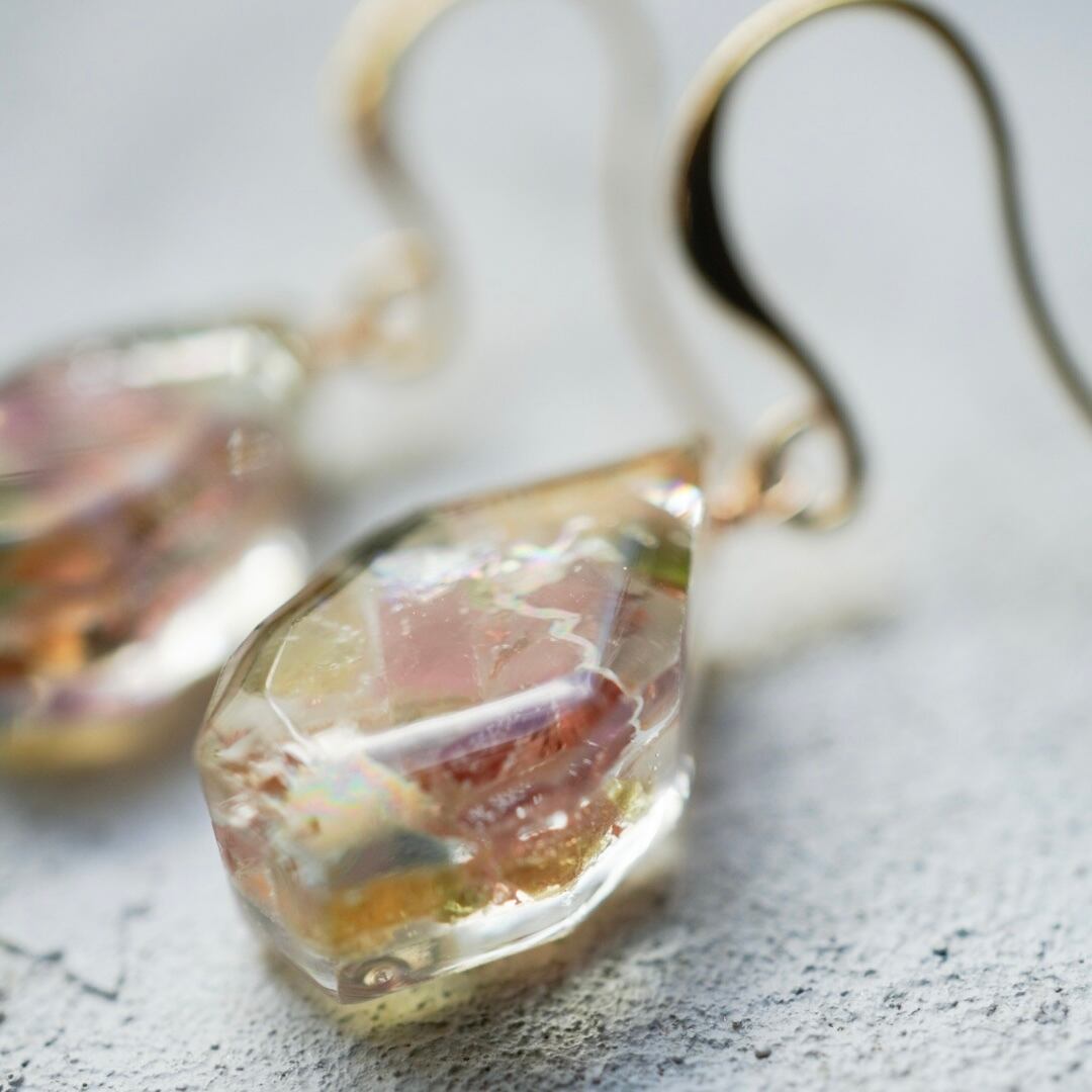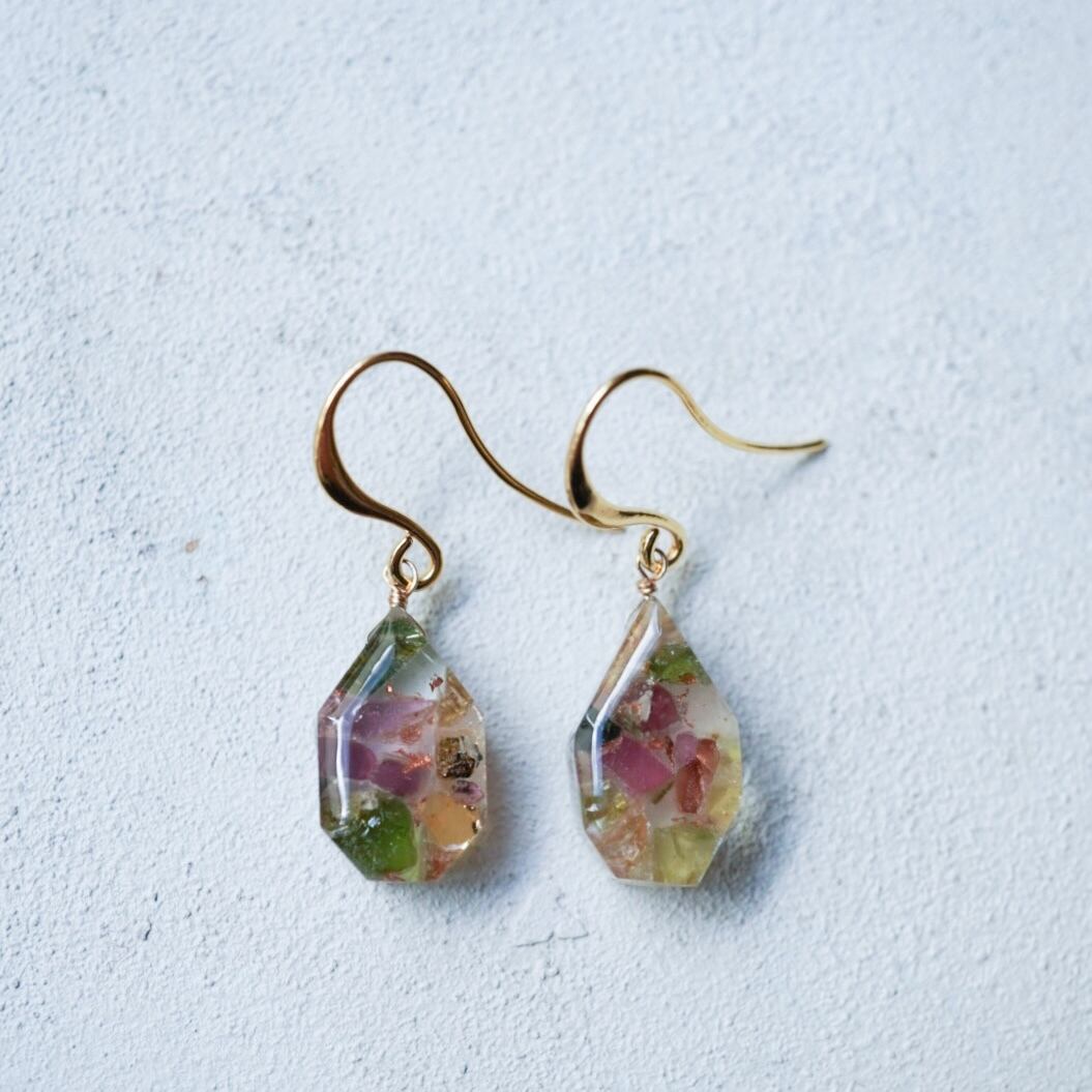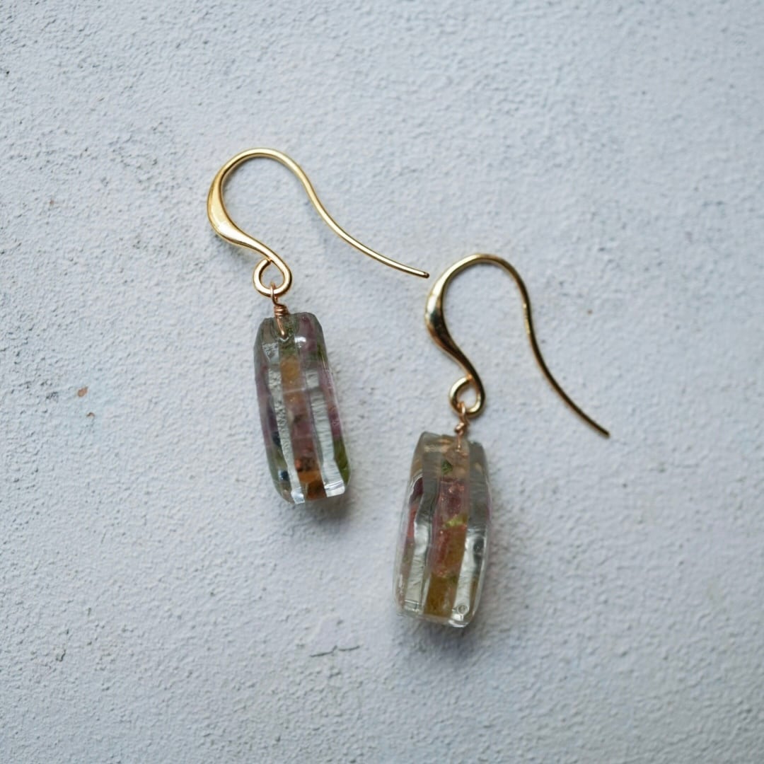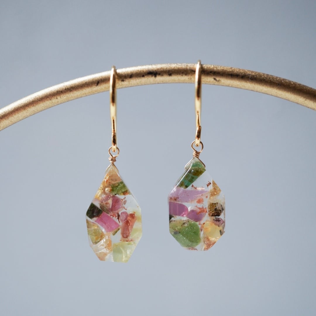 透明感のある水晶で、砕いたトルマリンを挟み込んだ合成石を使用したフックピアスです。
