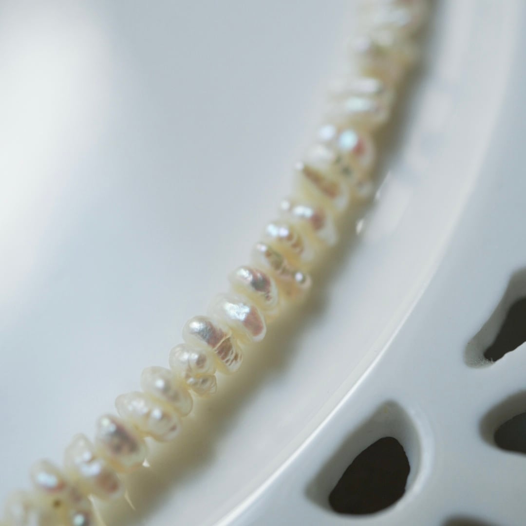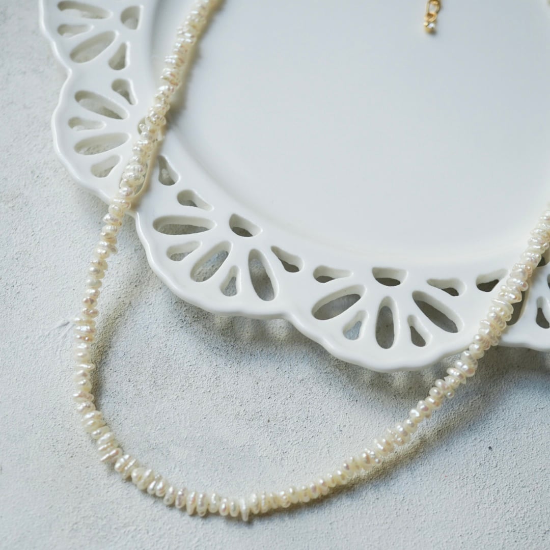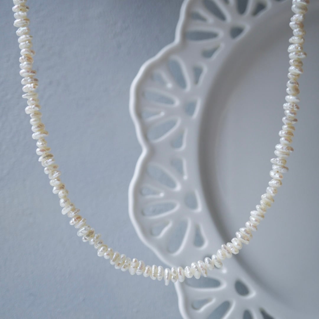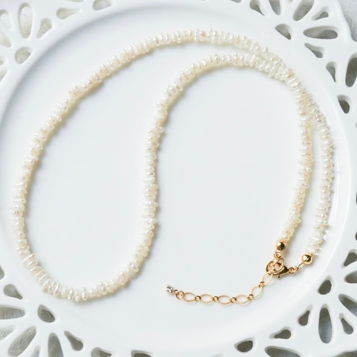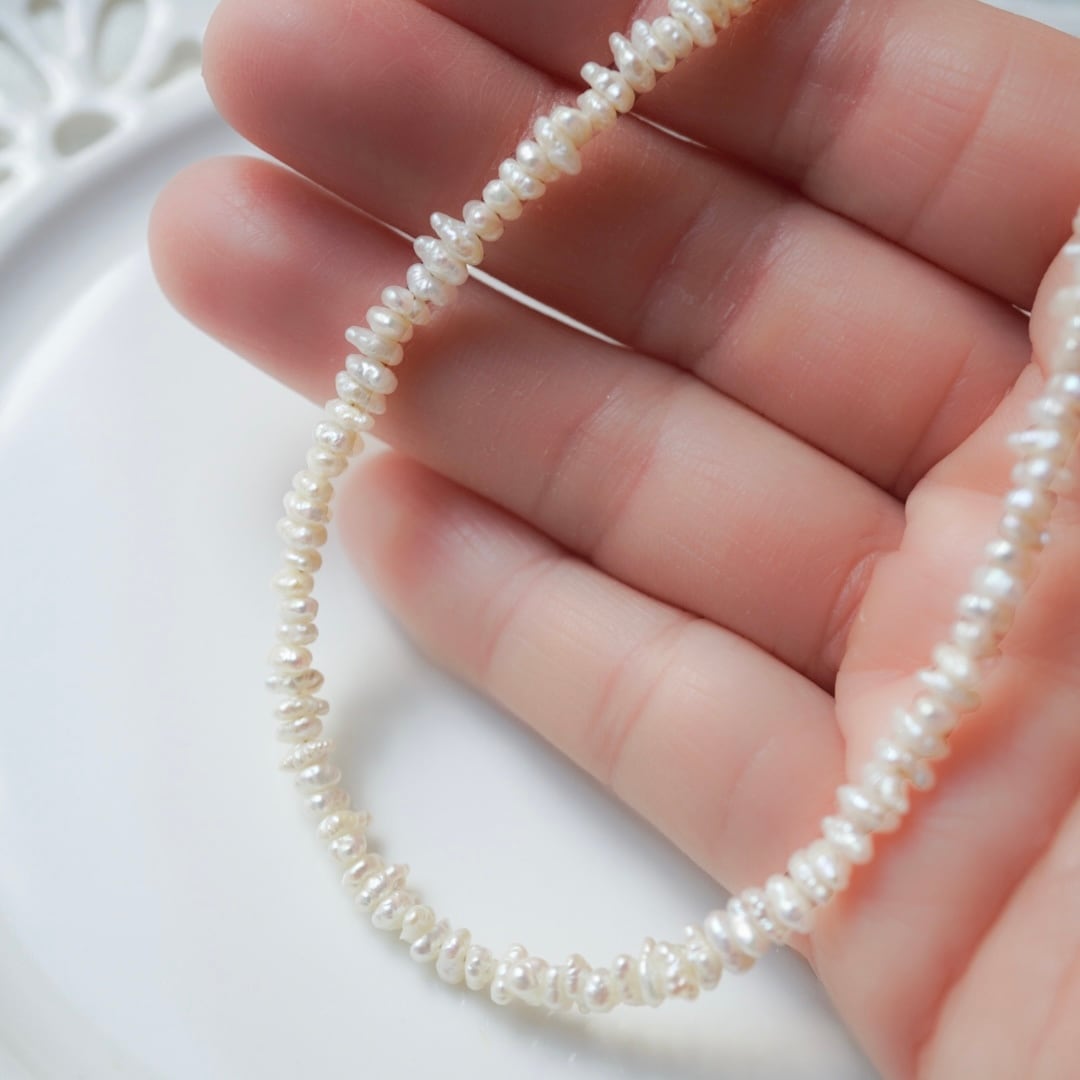 小さな淡水パールの“クシュクシュ”とした連なりは、光を受けるたびに繊細にきらめき、きっちり揃いすぎない上品さを感じさせてくれます。