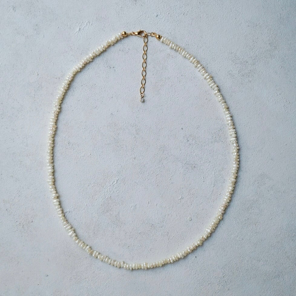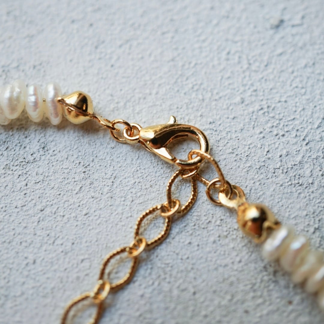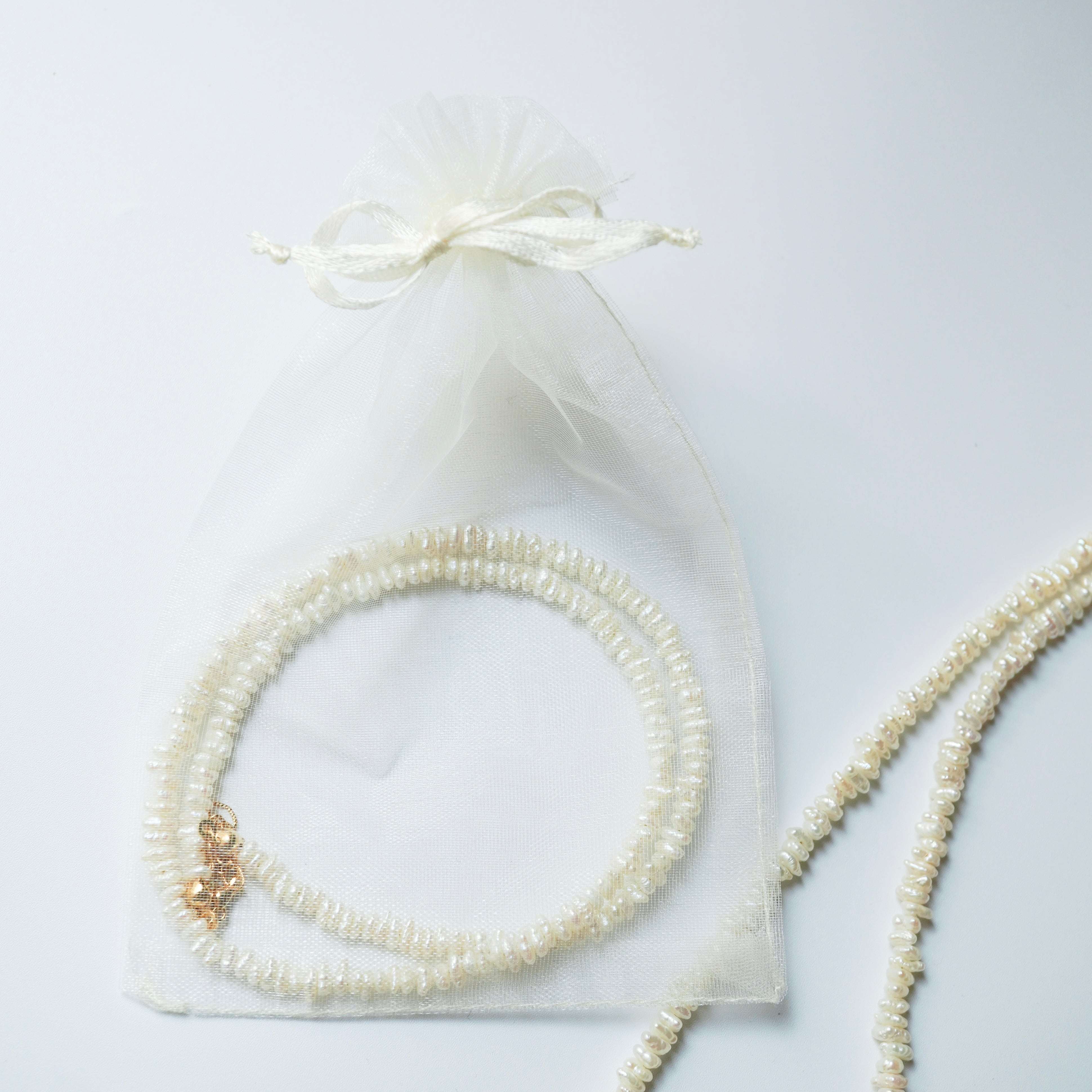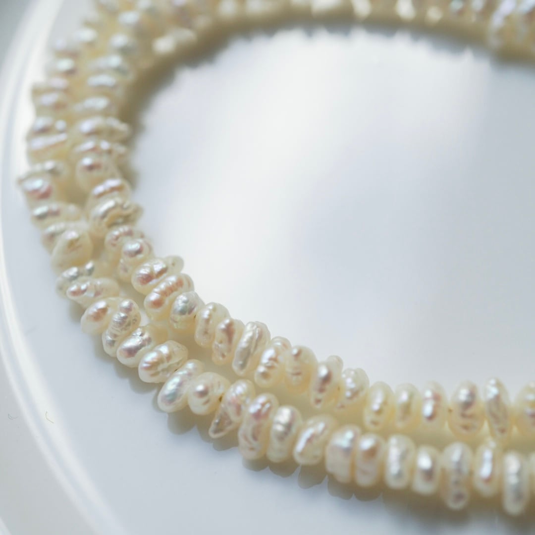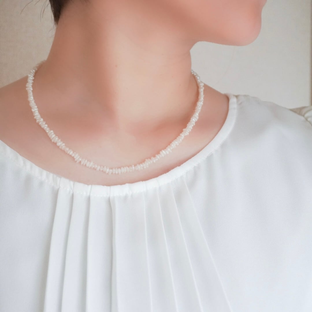 小さな淡水パールの“クシュクシュ”とした連なりは、光を受けるたびに繊細にきらめき、きっちり揃いすぎない上品さを感じさせてくれます。