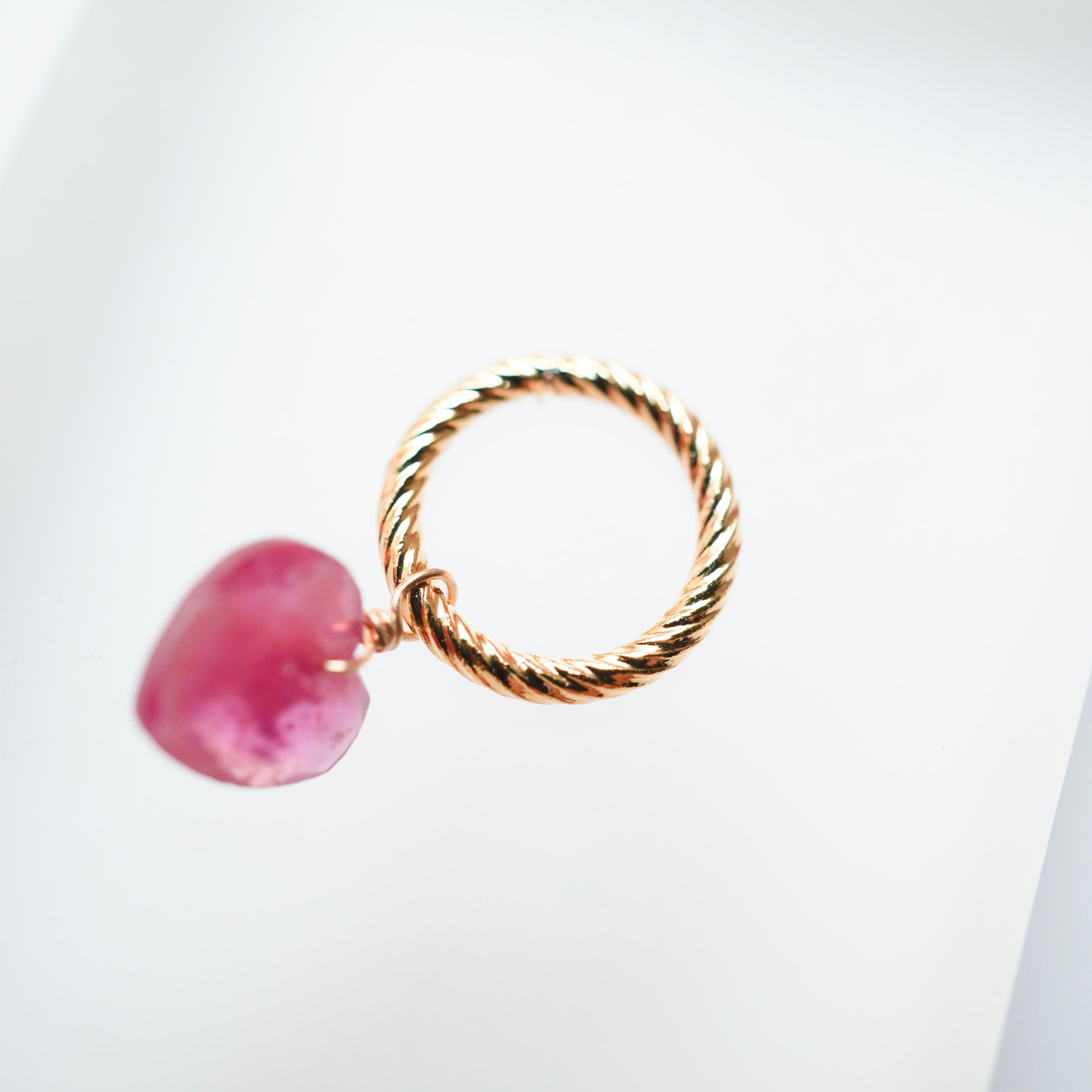 ルビーハートイヤーアクセサリーの制作過程で、ペアにはならなかった一粒のルビー