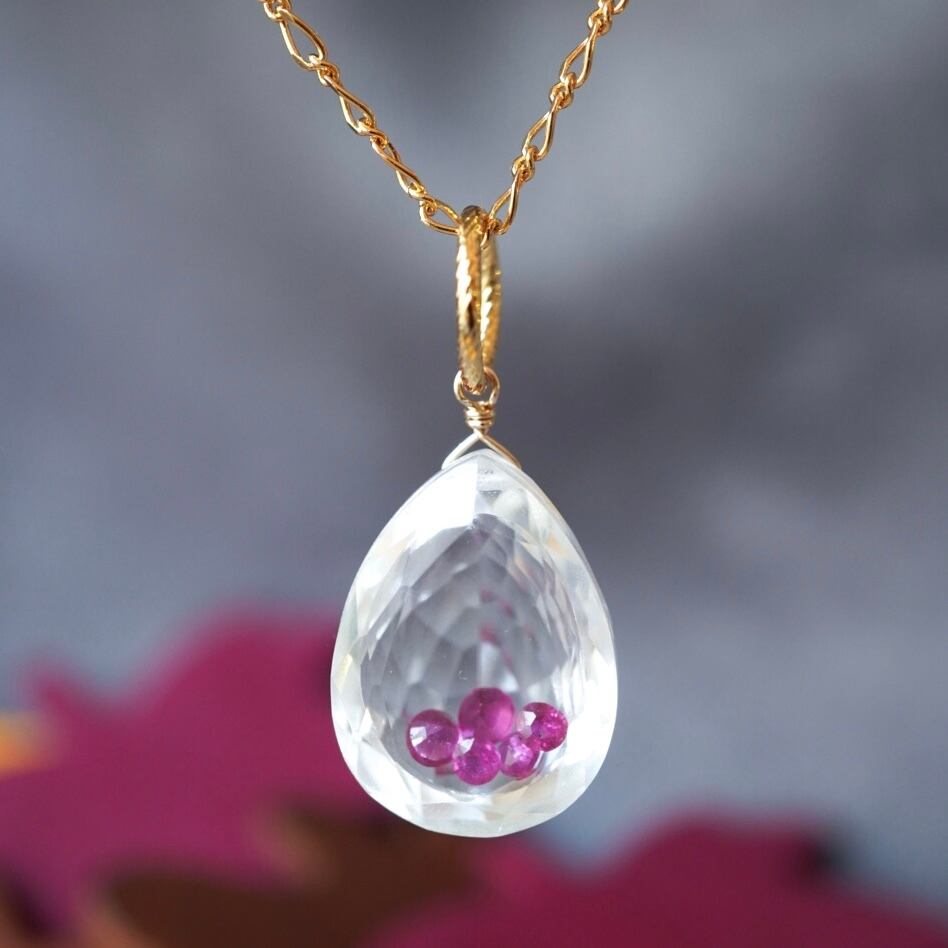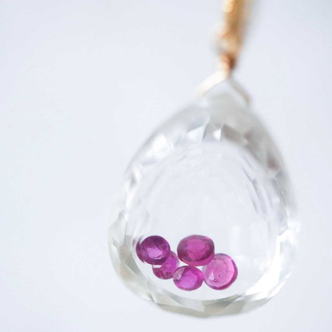透明度の高いクリスタルの中に、小さなルビーを数粒そっと閉じ込めたトップが美しい、特別なネックレスです。
