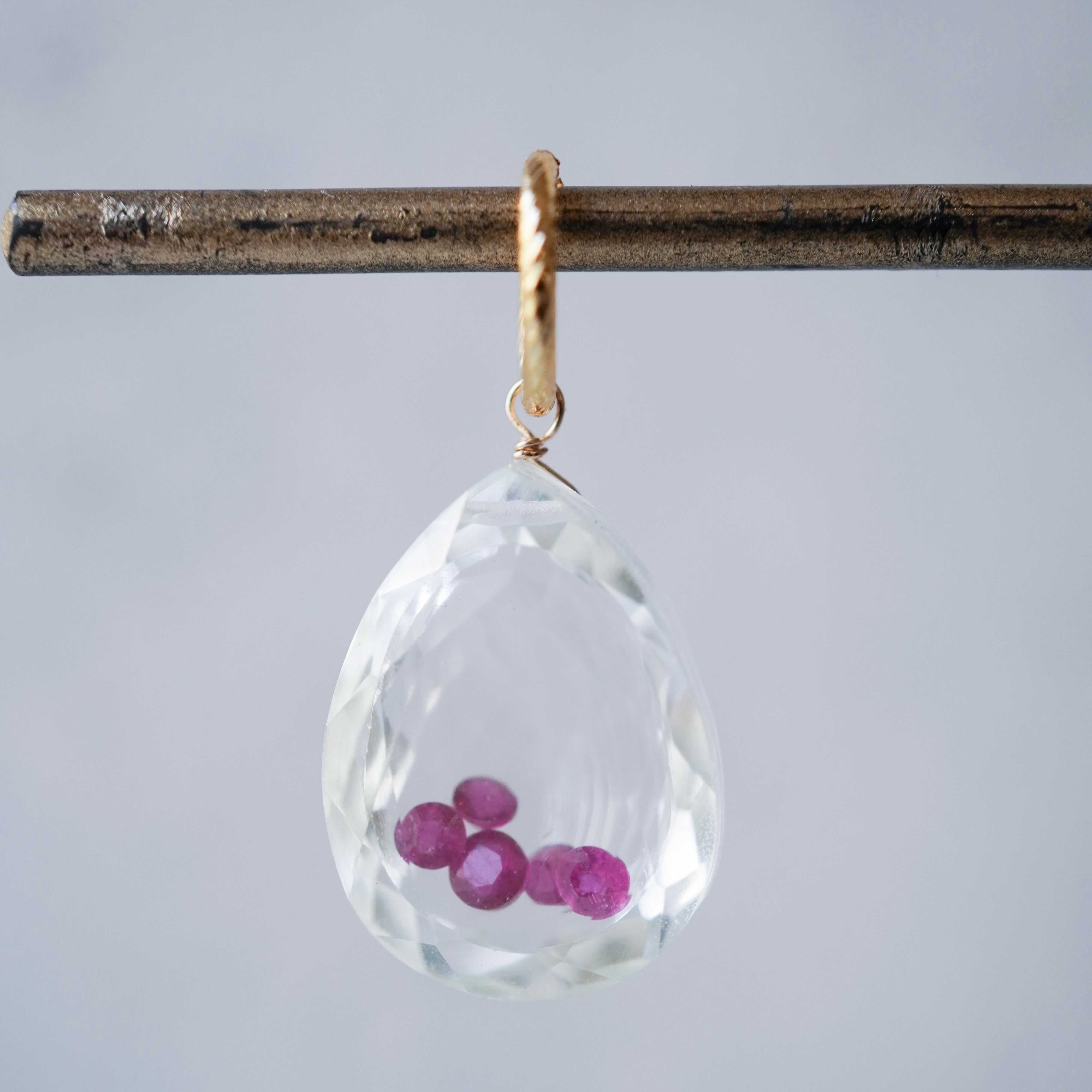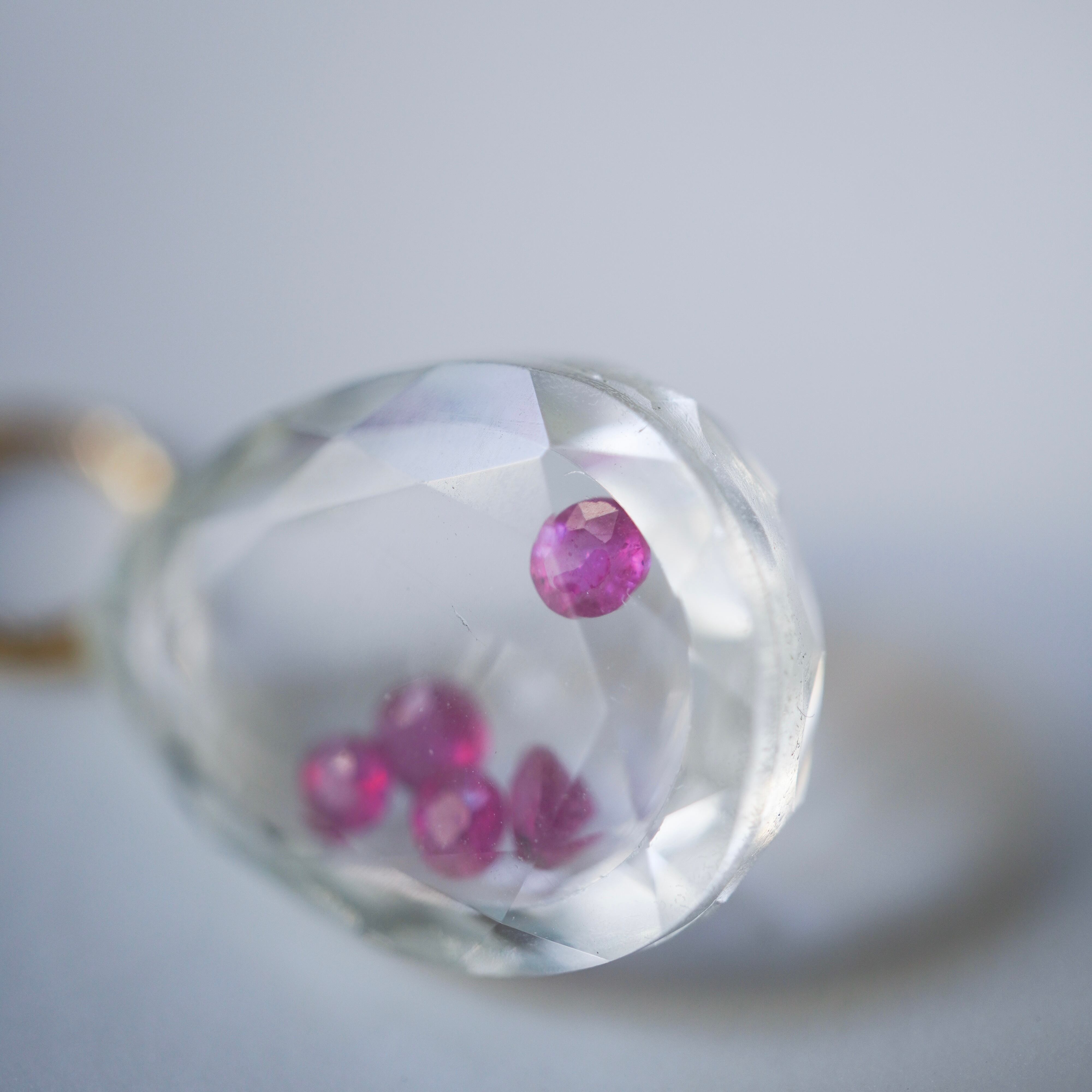 クリスタルにもルビーにも丁寧なカッティングが施されており、光が差し込むたびに、中のルビーがふわっと揺れてきらめきます。