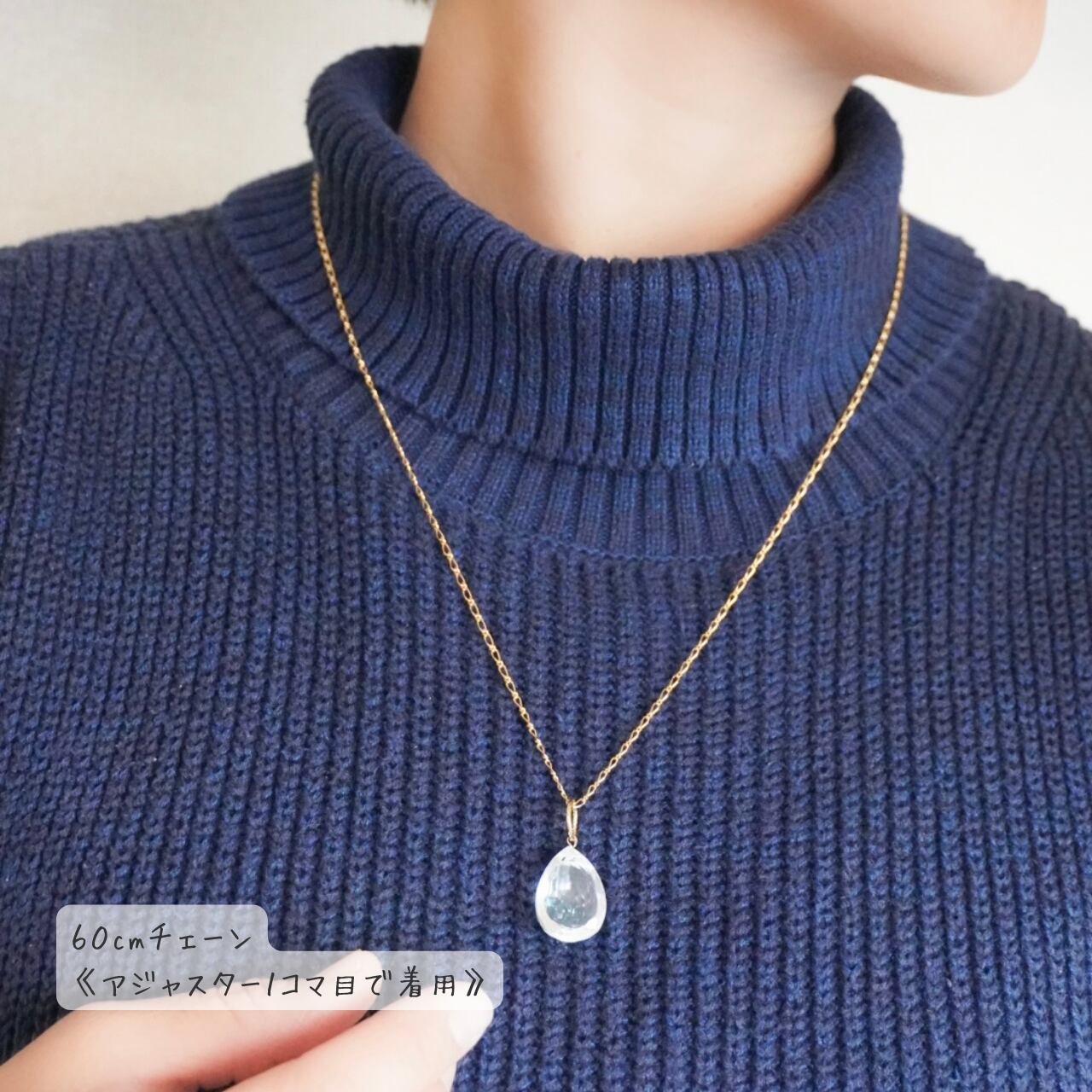 ネックレス本体との継ぎ目の丸カン部分に留めることも可能ですが、よりスムーズにお使いいただくためにはアジャスターの一コマ目に留めていただくのがおすすめです。