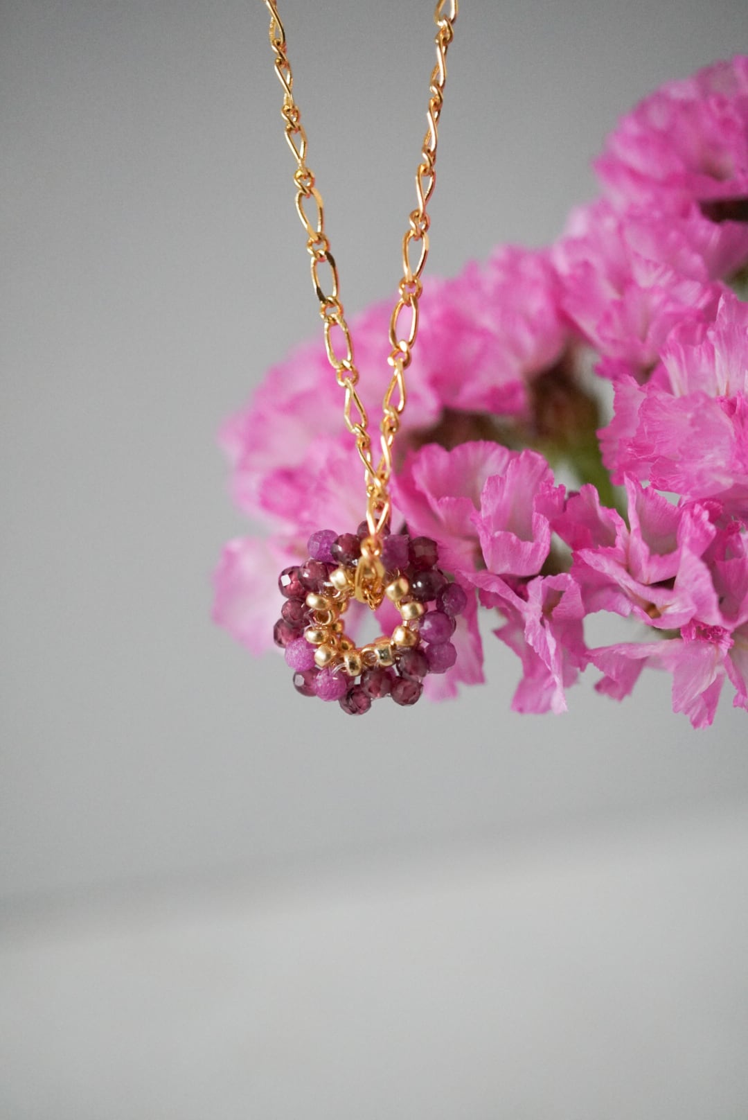 天然石ビーズ、ガーネットとルビーを編んで作った