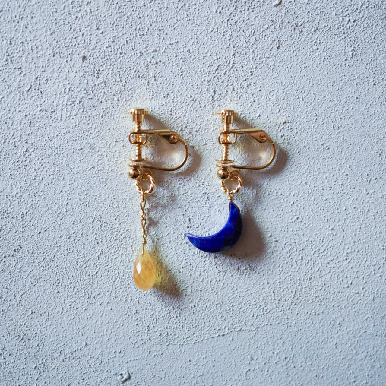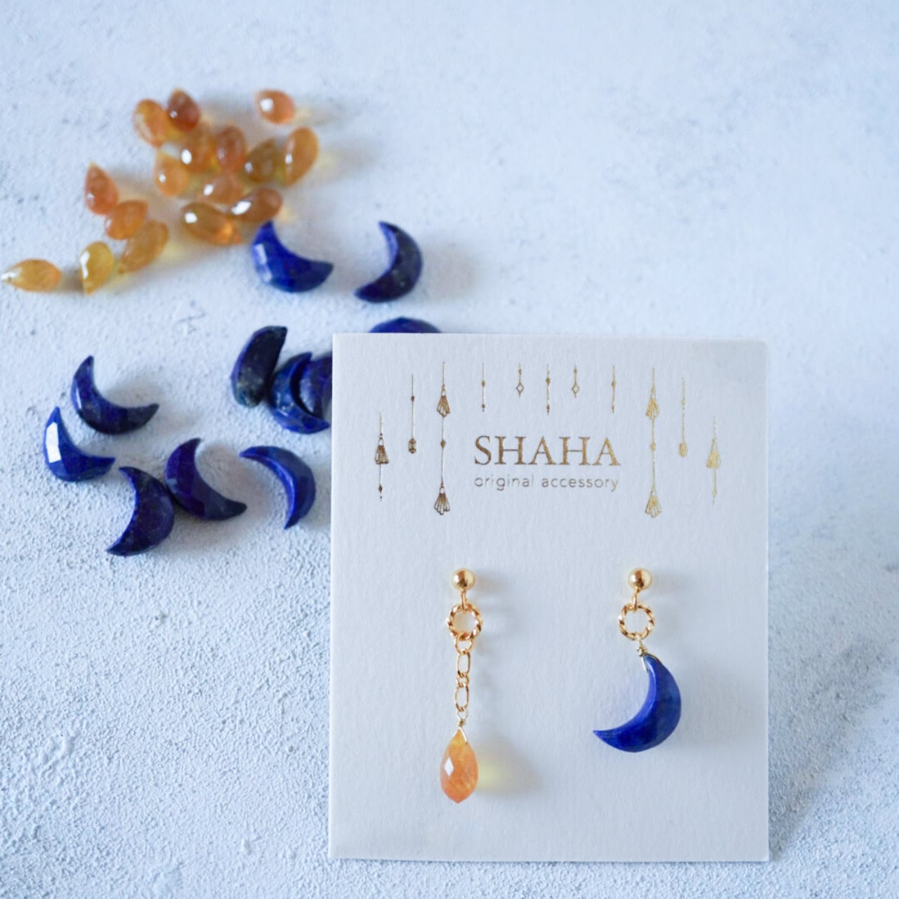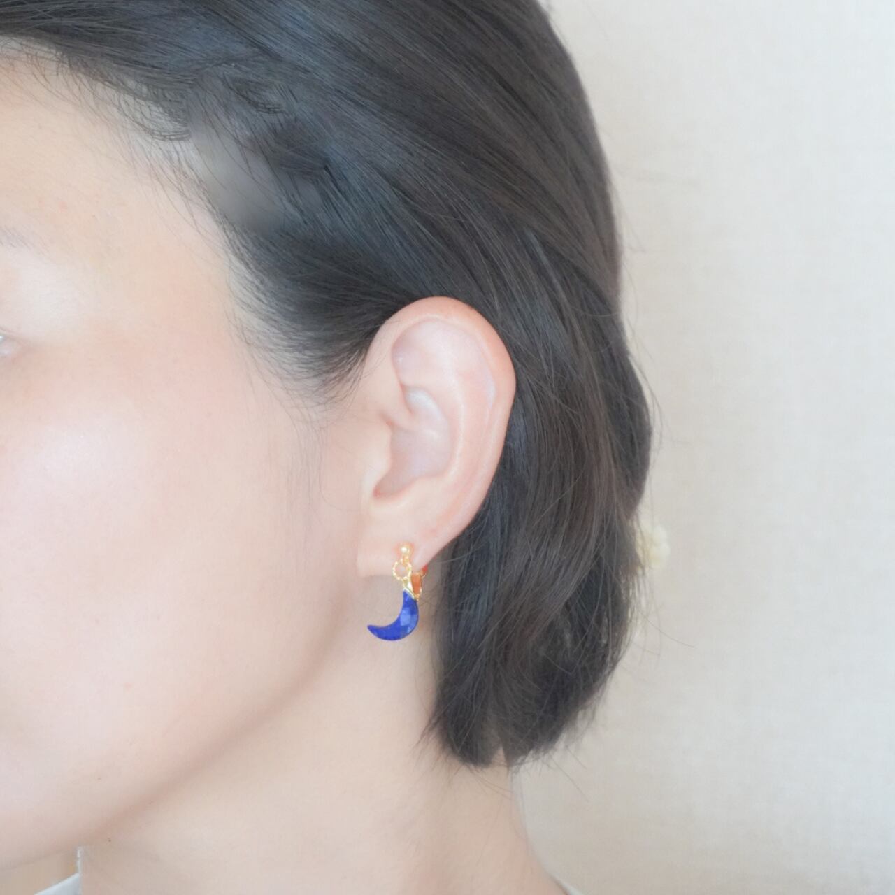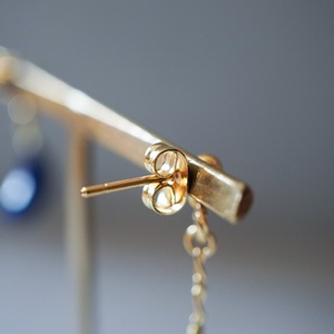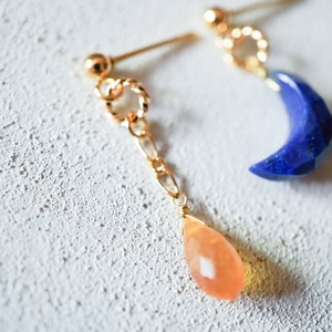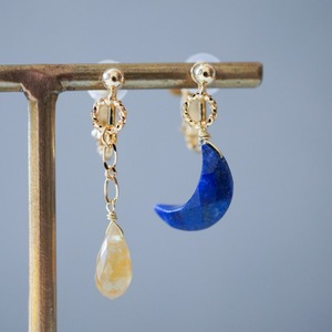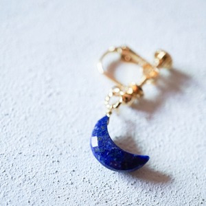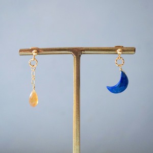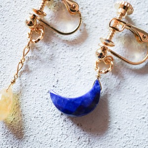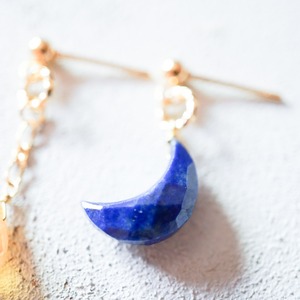 ラピスラズリの青いお月様と9月の誕生石サファイアを使用したアシンメトリー(左右違いのデザイン)イヤーアクセサリーです