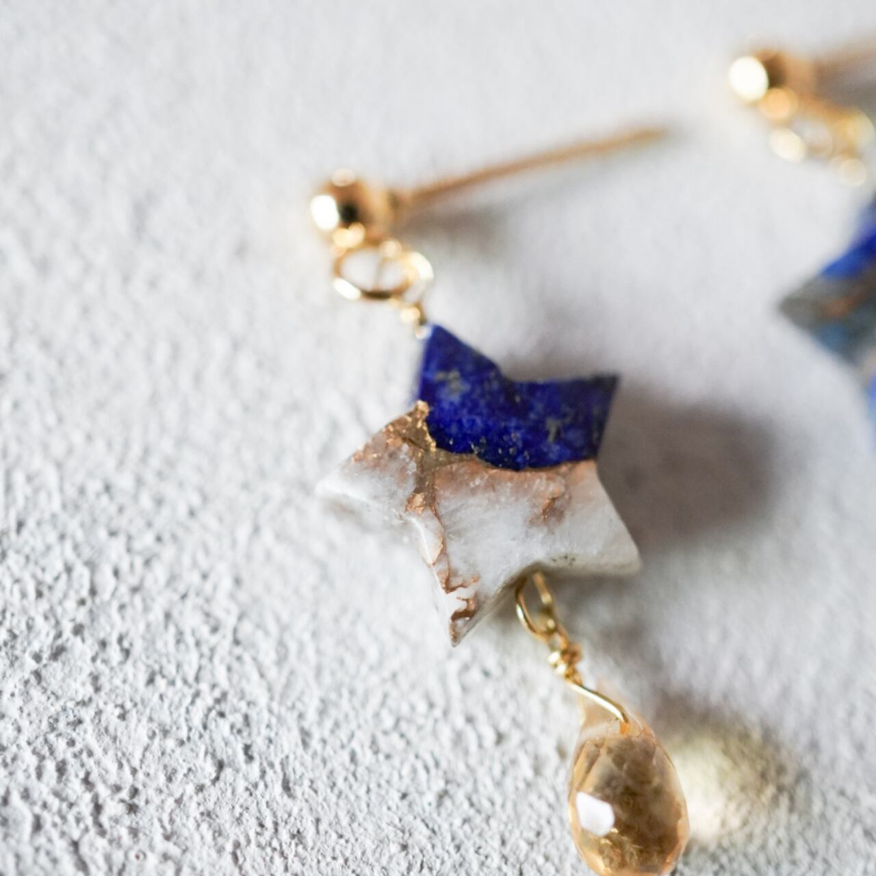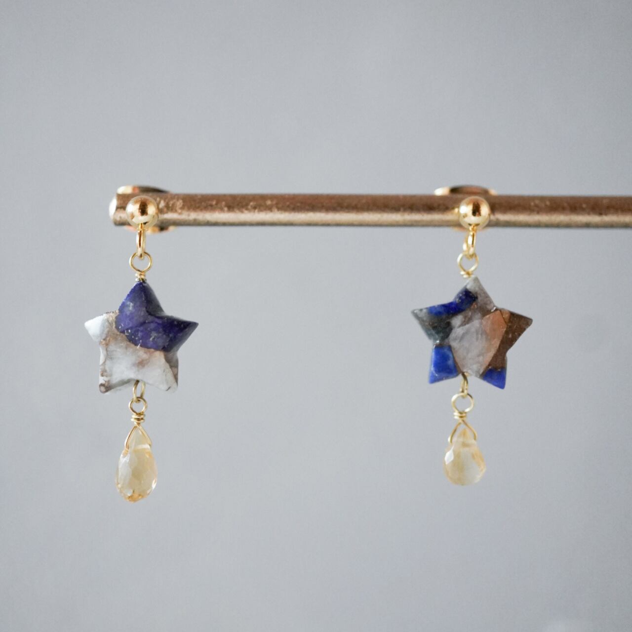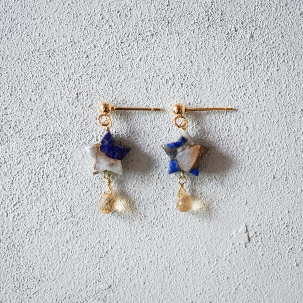 お星様の形をしたラピスラズリカルサイトコッパーとそこかかる滴る雫を表したイヤーアクセサリーです