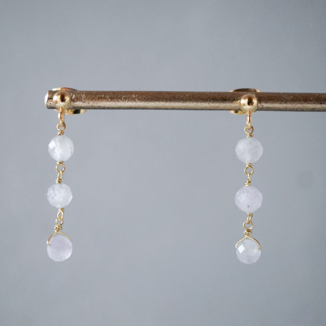 3連の薄いカラーアメジストを前に2連の濃いカラーアメジストを後ろに配した、前から見ても後ろからみても…横から見ても揺れが上品なイヤーアクセサリーです